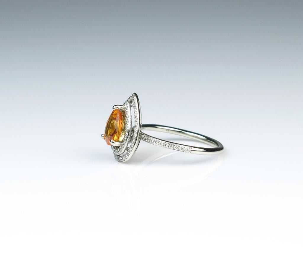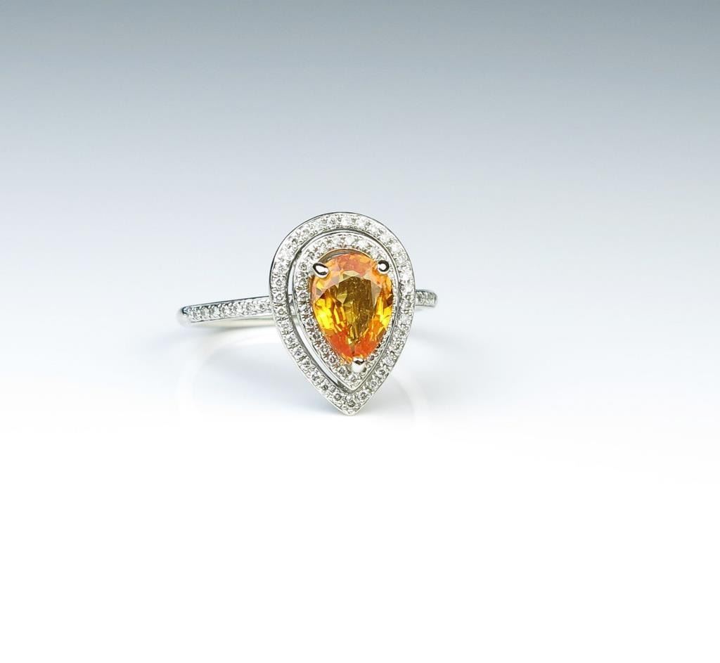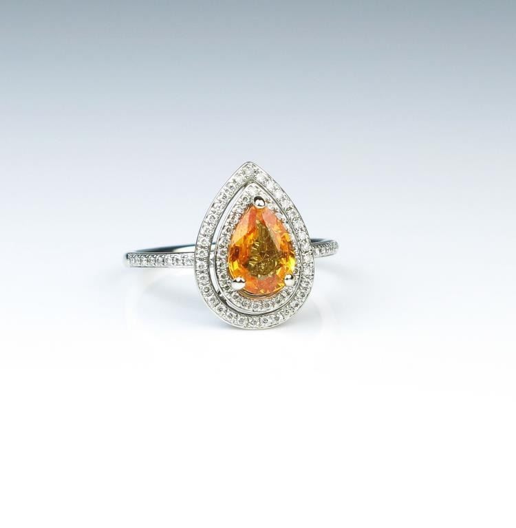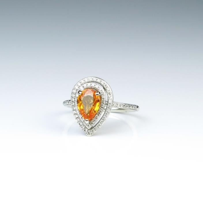 Elegant fine quality Orange Sapphire and Diamond ring featuring an approx. 1.50 carat pear shaped Sapphire set in a double halo setting of 14 karat white gold studded with 76 full cut Diamonds weighing approx. 0.80carats with G-H colors and VS/SI clarity. Retail $2,500-$3,000 Estimates $1,500-$2,000