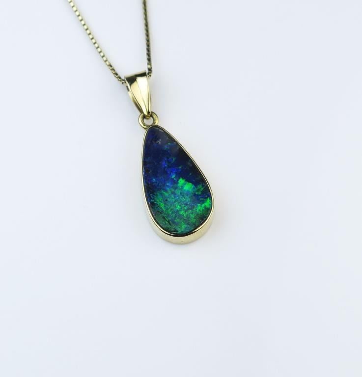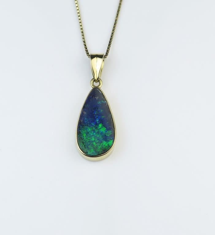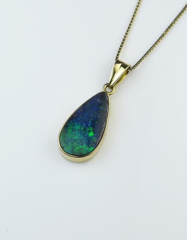 Beautiful 18 karat Australian Black Opal pendant showcasing a fine quality pear shaped Opal with luminous hues of blues and green set in hand crafted 18 karat yellow gold pendant and chain. Retail $2,000-$3,000Estimates $1,000 -$1,500