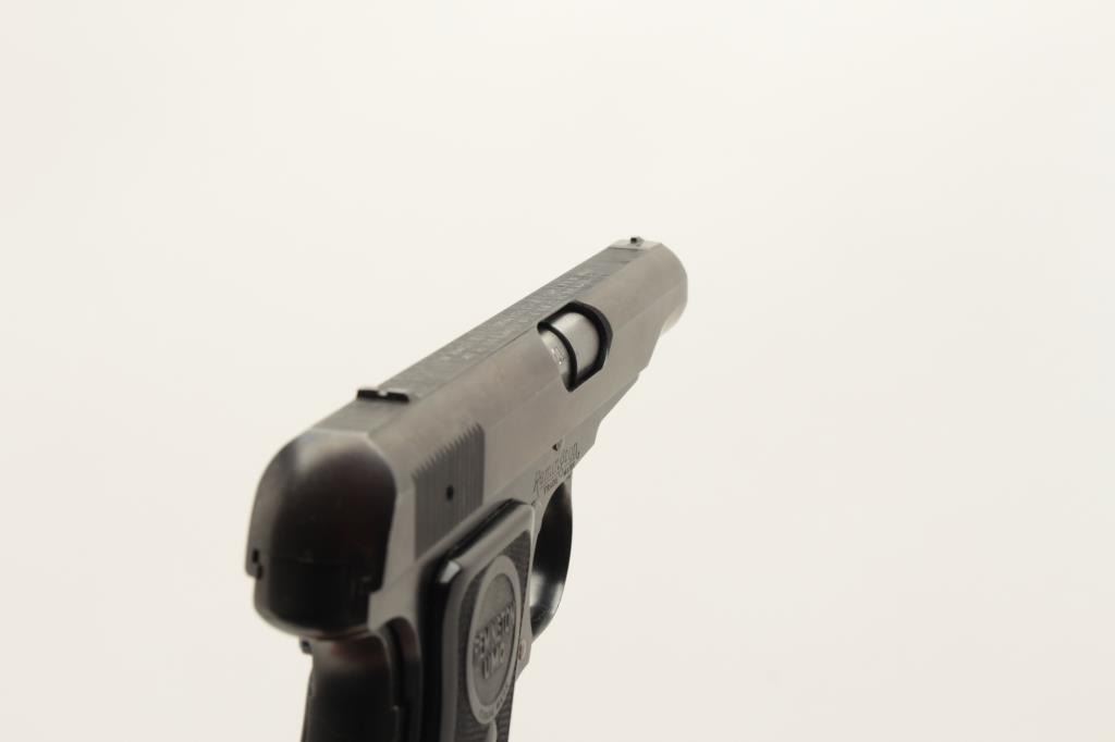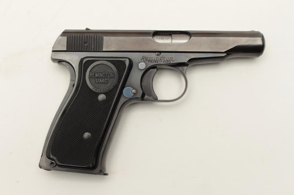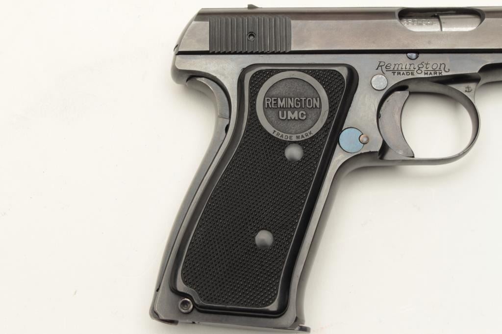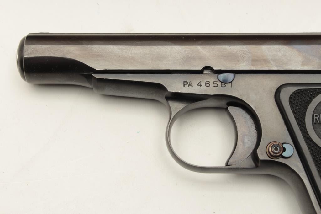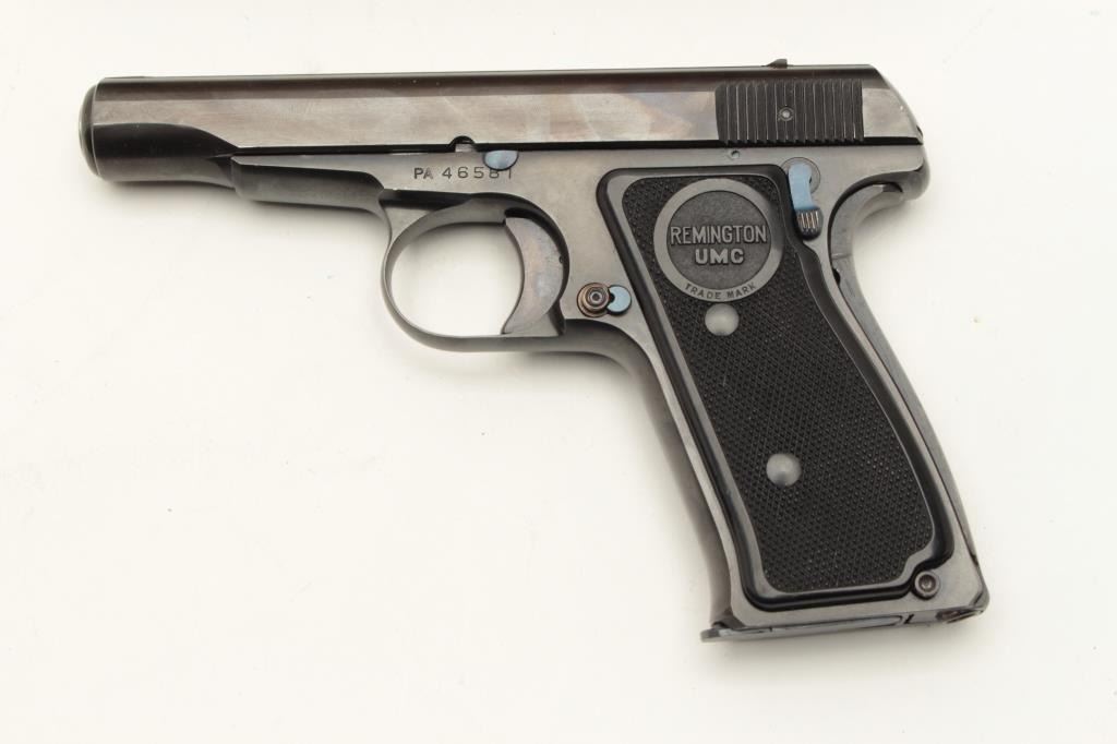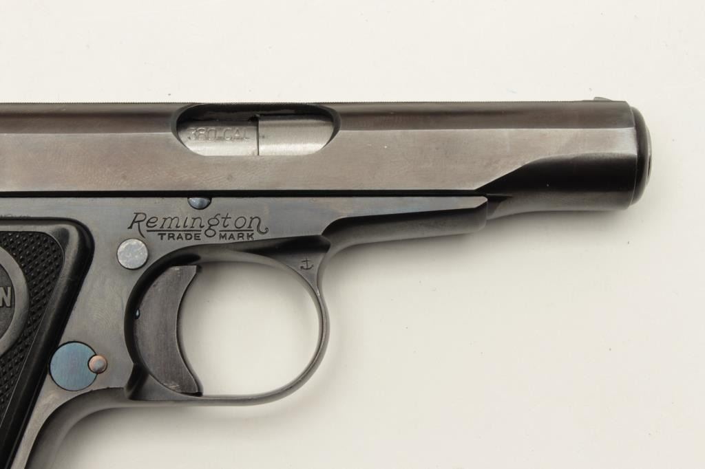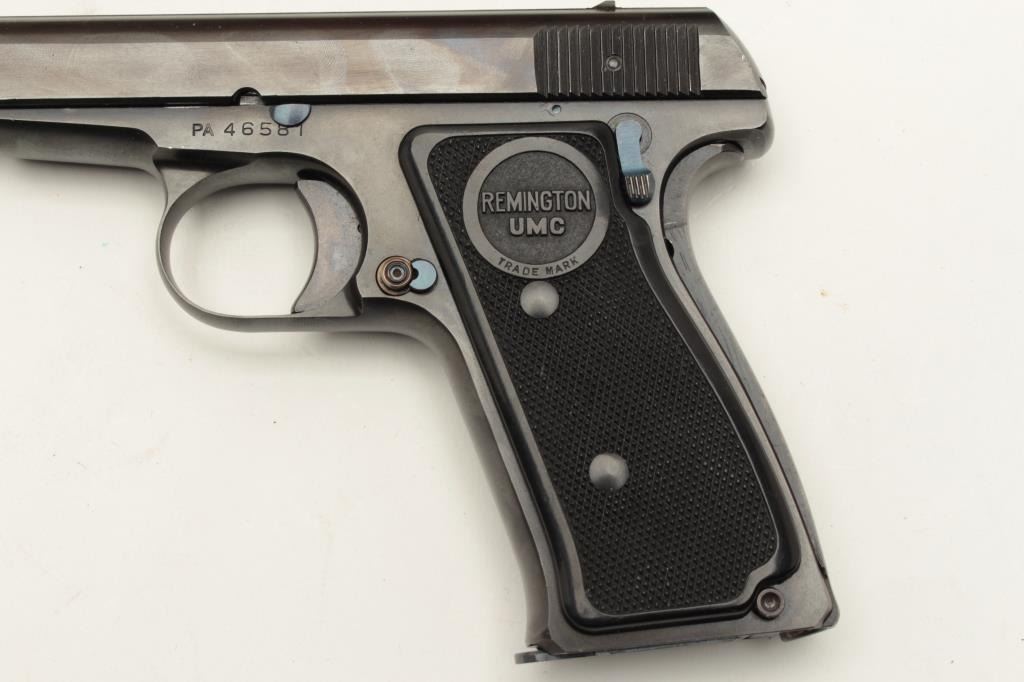 Remington Model 51 semi-automatic pistol, .380 caliber, 3.25” barrel, blued finish, checkered black grips, S/N PA46581, in overall excellent condition showing minimal use or handling, fine bore, crisp action fine grips; accompanied by factory cardboard box displaying minor repair and with instructions sheet. (C&R). Est.: $2,500-$5,000.