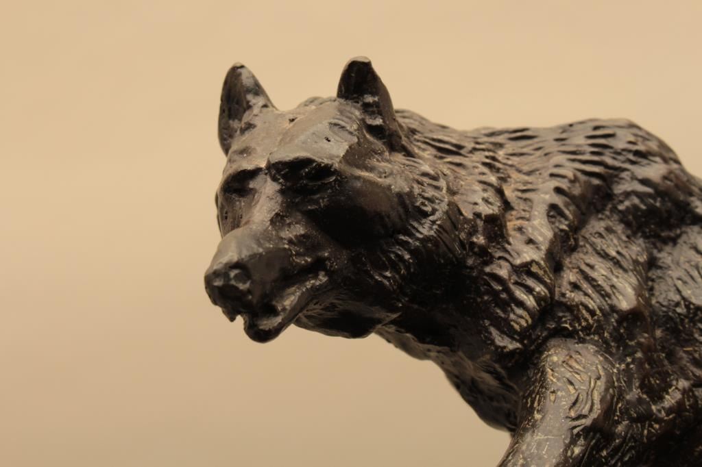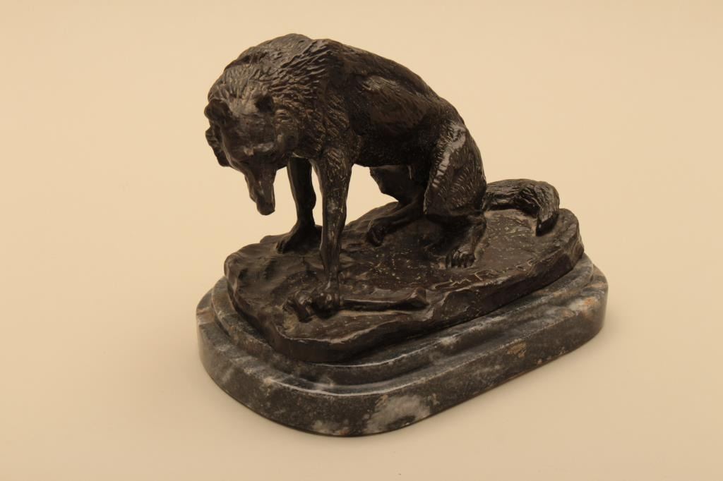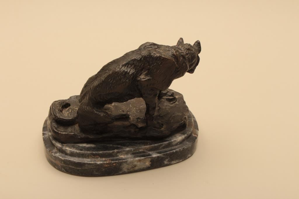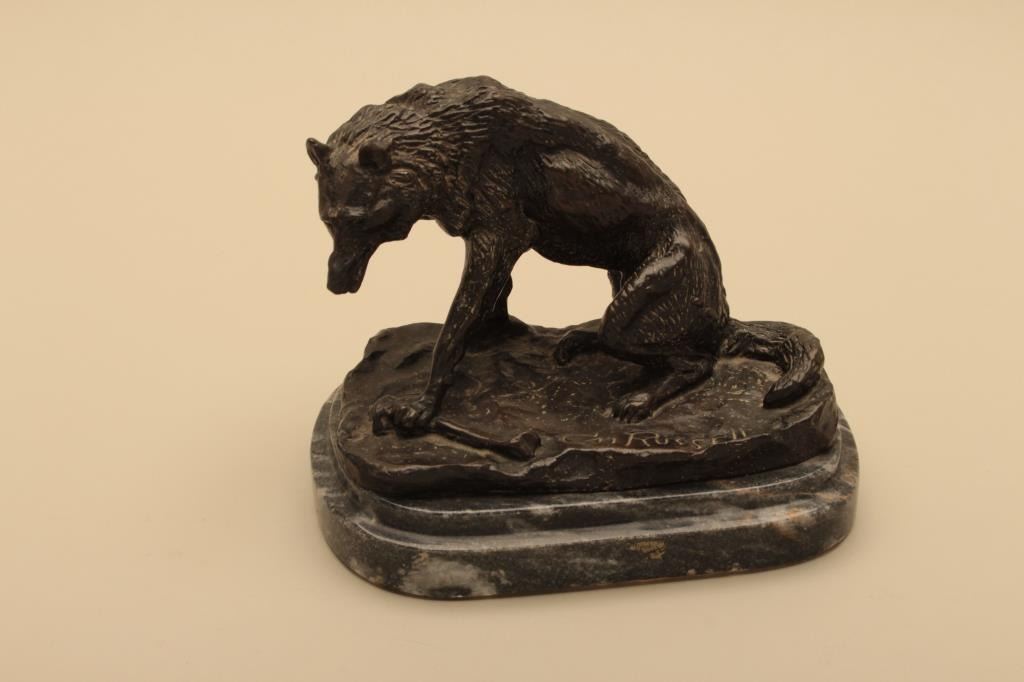 Posthumous casting of Wolf by C.M. Russell. Measures 6” in height not including stone base. 1970s cast by Eagle Art Works St. Louis who did a great job on patina and quality casting. Far superior too recent castings.Est.: $350-$700