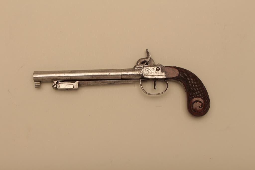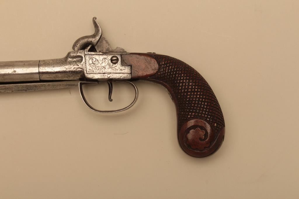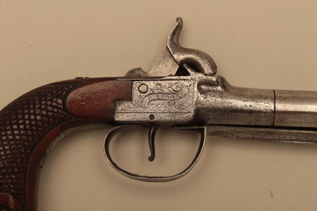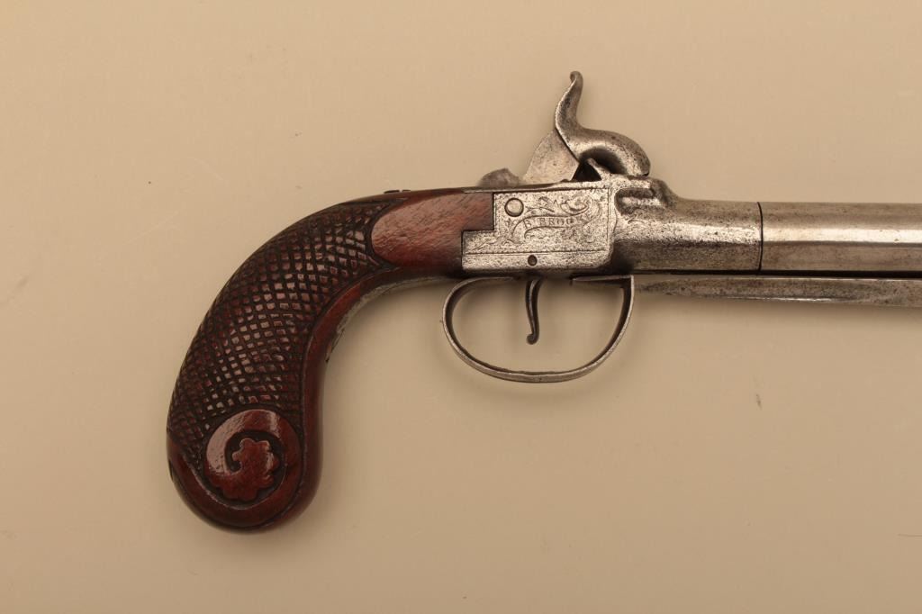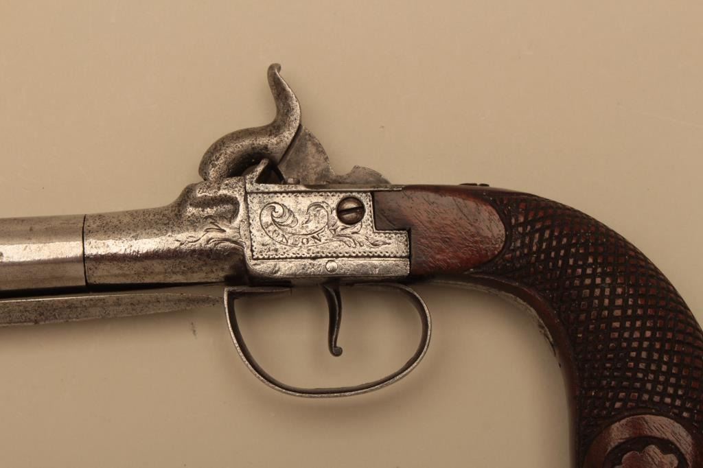 Large English spring bayonet percussion pistol by B. Brooke, London circa 1850. Engraved box lock action with 5 an 1/2 inch trun off barrel. 11 and 1/2 inches overall. 4 inch long triangular bayonet. Carved andcheckered walnut grip. Metal has been polished bright. Bayonet springs out and locks crisply and action works well. Walnut grip crisp with high polish varnish. An unusually large snap bayonet English pistol.Est:$500-700