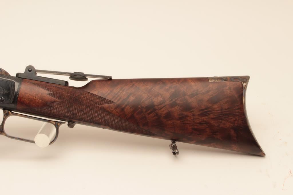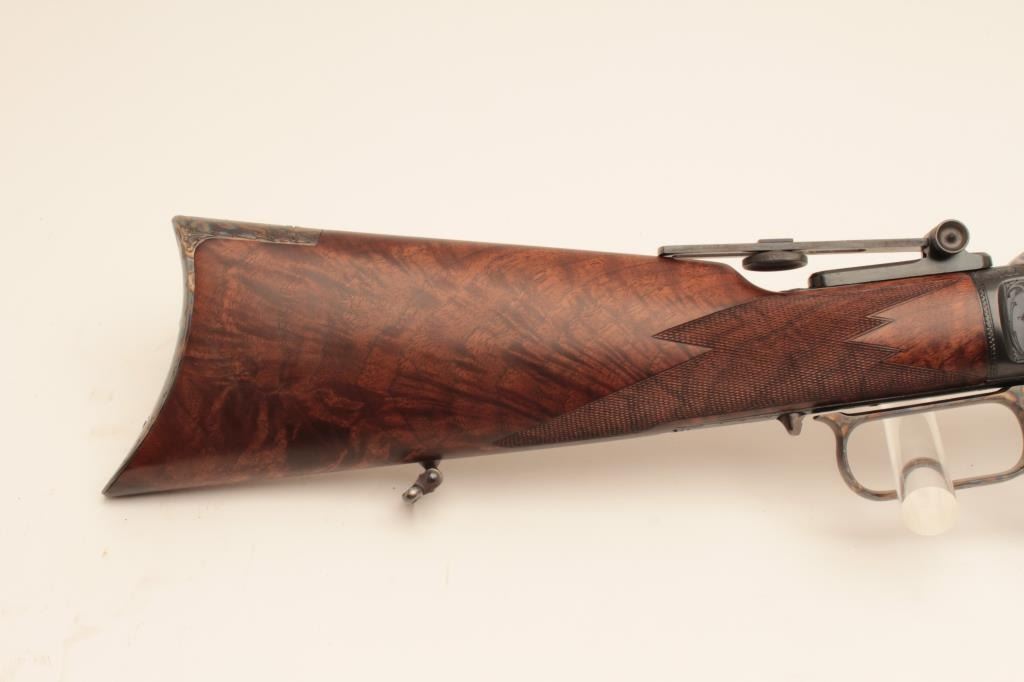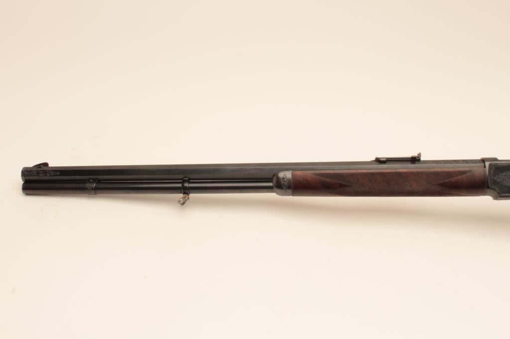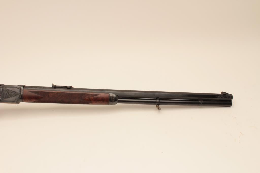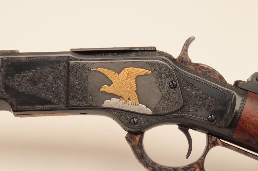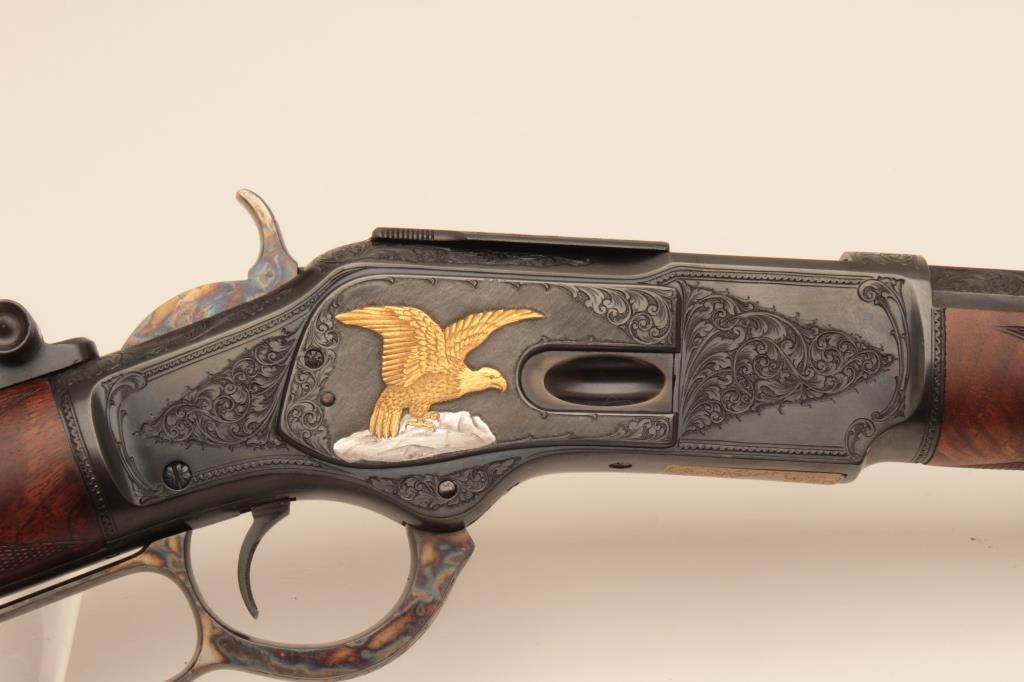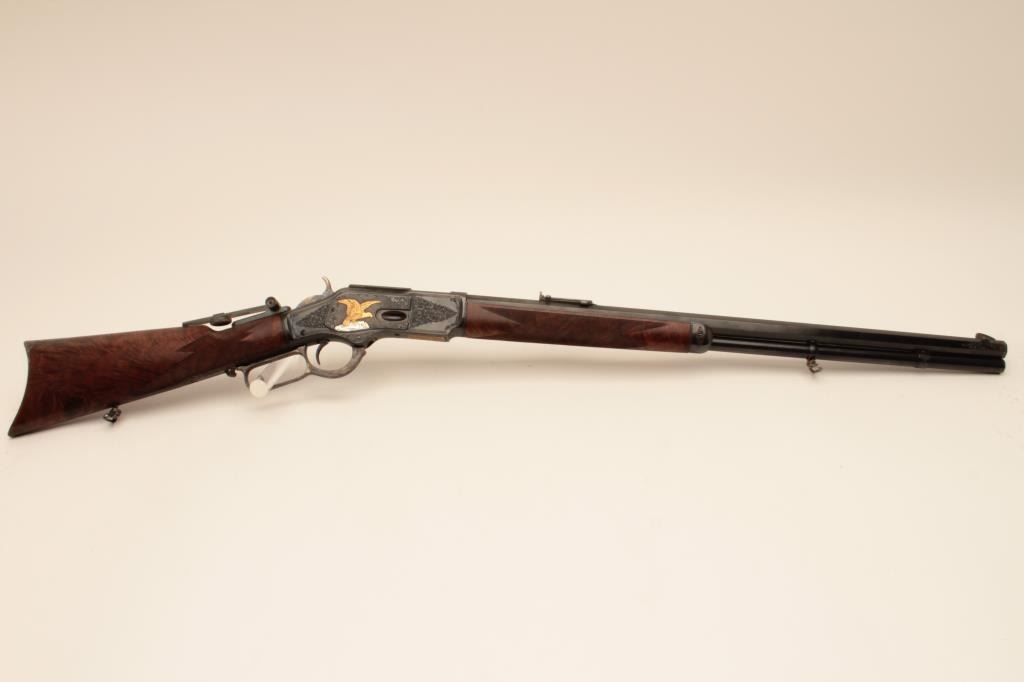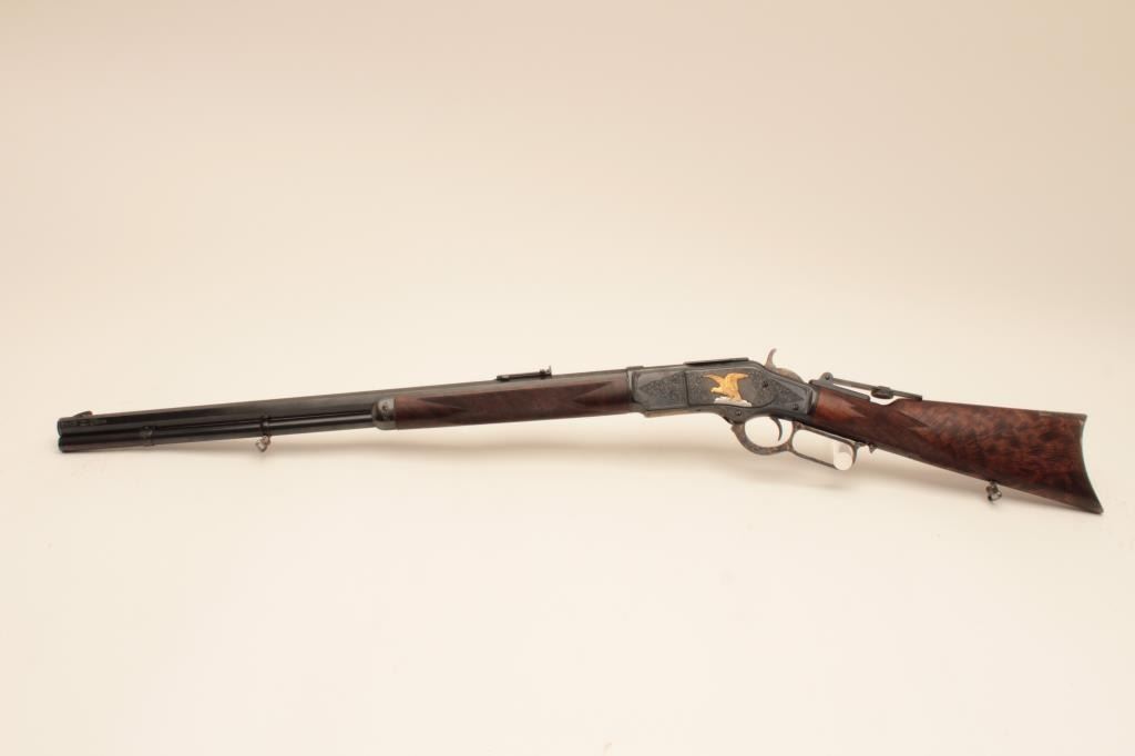 Exhibition quality 1873 Winchester rifle customized by London Guns of Santa Monica and engraved and gold inlaid by Angelo Bee. London guns was the west side of L.A.’s most exclusive gun shop circa 1970s to 80’s. Owned by Phil Brown and Jules was his top workman who stocked and finished this master work. The rifle shows a 24” octagon barrel in .44-40 caliber, full mag, and crescent butt. This Winchester shows superb burl walnutstock that is finely checkered. Mounted with express type folding rear sight, venier tang sight and Rocky Mountain style blade front sight. High grade European style sling swivels. This show piece is masterfullyscroll engraved and multi-color gold inlaid with eagles on both side plates. This work is signed by Angelo Bee former European Master Engraver for Browning. The rifle has been fully reconditioned and restored with aEuropean grade blue finish and case hardened small parts. The condition is excellent as restored. Est.: (Antique) Est.: $5,000-$10,000