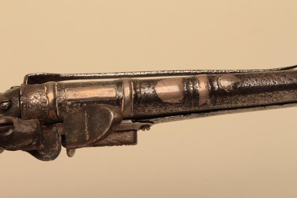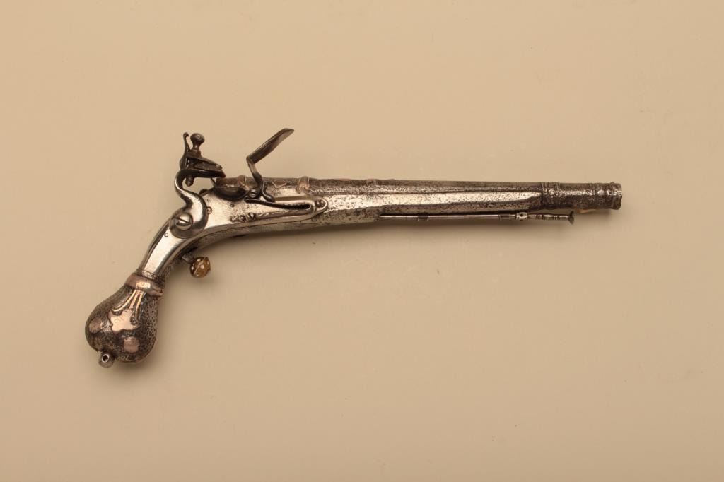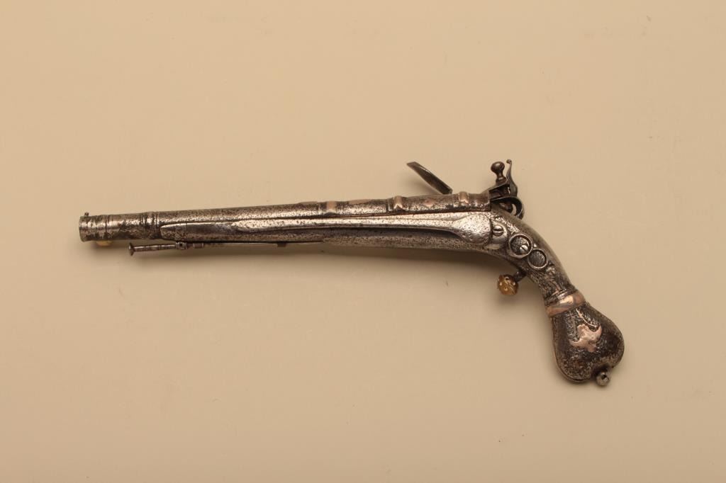 Early and rare Scottish heart butt flintlock belt pistol with silver inlay originally circa about 1670-1700. The pistol measures 13 7/8” overall with a 9 ¾” barrel of .56 caliber smoothbore. The barrel and stockshows generous early style silver inlays. The original fancy belt hook and ball trigger are retained. Correct style rammer with fancy metal work. The lock, hammer and frizzen are of later period and in our opinion replacedin the pistols working life. These parts show aging and hand crafting but not as early as this stock. The stock shows age and distress but good overall. (Antique) Est.: $3000-$6000
