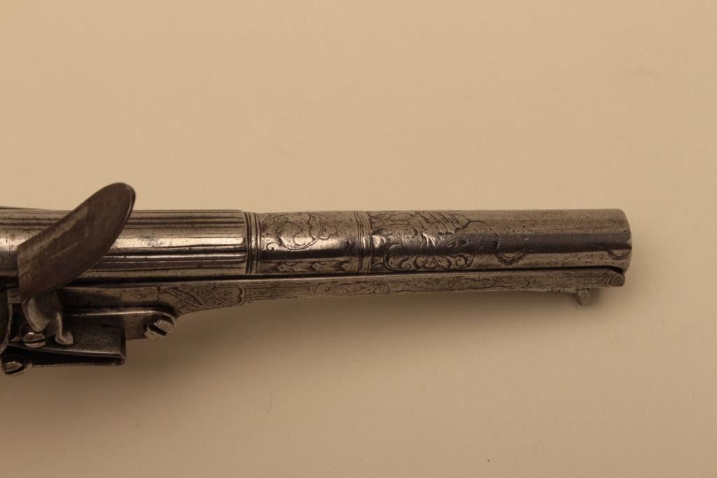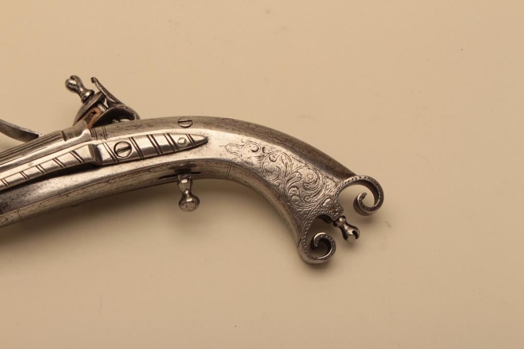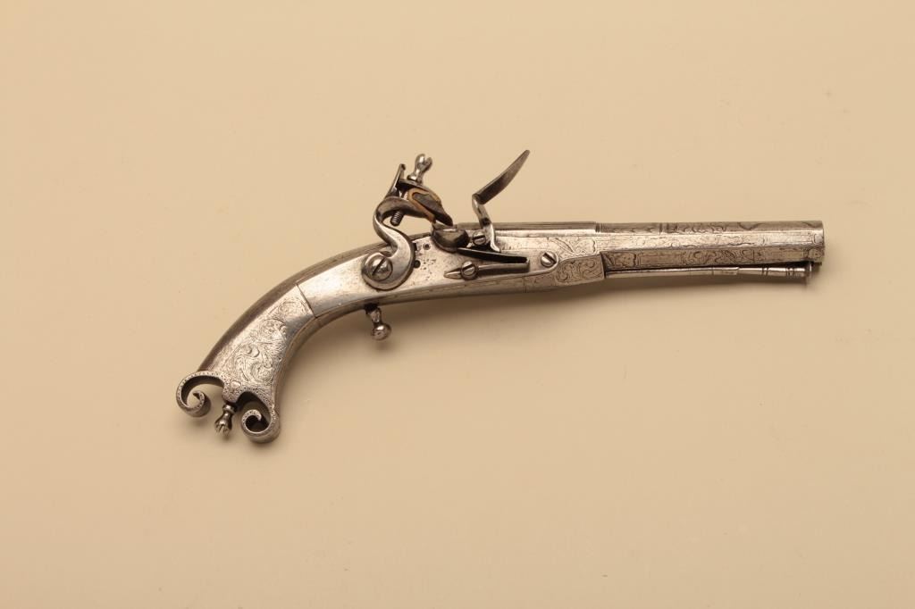 Scottish Ramshorn butt Flintlock pistol circa late 18th to early 19th century. Measures 12 ½” overall with a 7 ½” barrel of .60 caliber smoothbore. Nicely engraved stock with barrel also engraved ¾ of the way to themuzzle (Unusual). Correct style belt hook and metal ramrod. Very good condition with minor wear to the engraving. Just the type officers carried from the Revolutionary war till Napoleonic era. (Antique) Est.:S2000-$4000