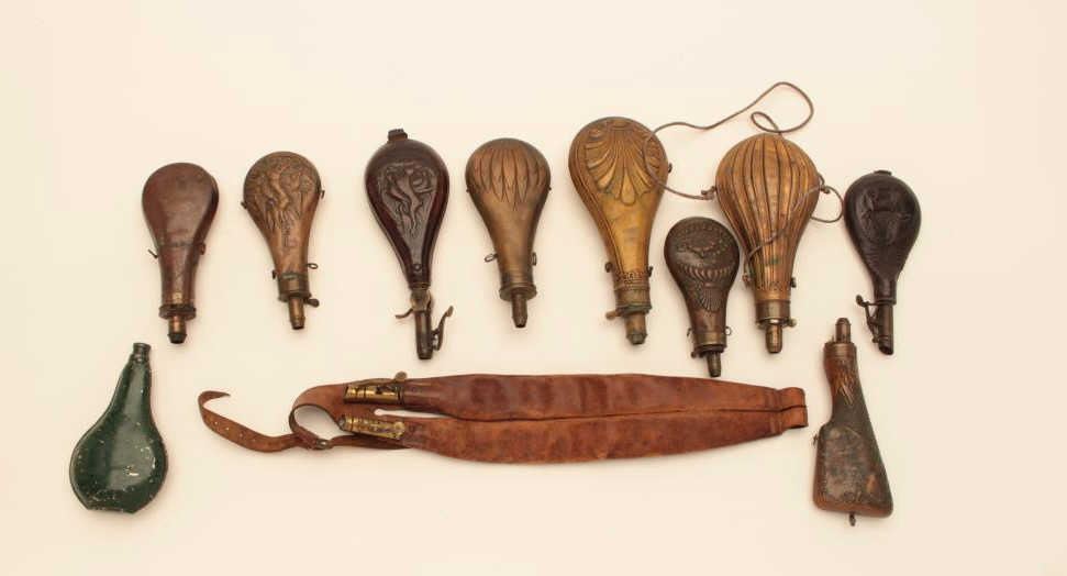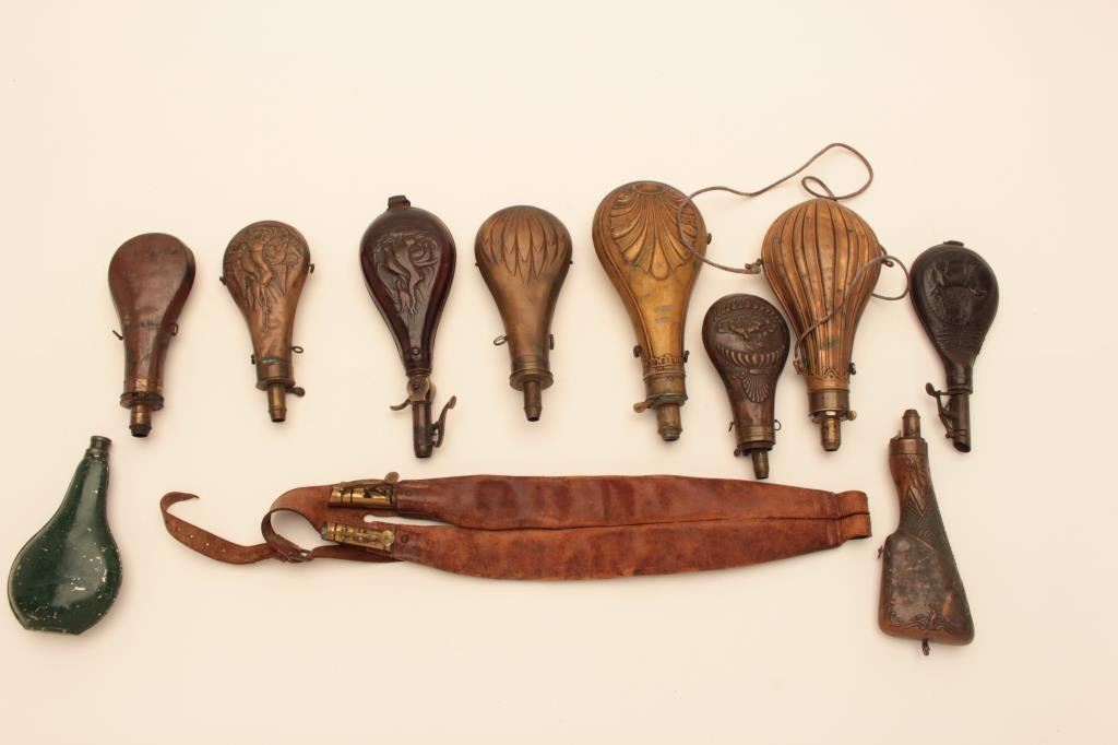 Lot of shotgun flasks and leather accessories from 19th century. Various conditions and original. 10 pieces. Est.: $300-$600
