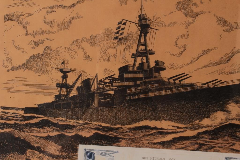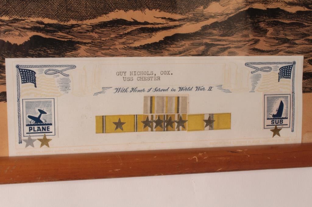 Vintage framed print of the USS Chester. Commissioned in 1930, the USS Chester served in the Pacific theater during WWII and was subsequently decommissioned in 1946. The wooden frame is in good condition and a cardmarked, “GUY NICHOLS, COX.” has been added. A nice piece for the WWII collector. Est.: $25-$50.