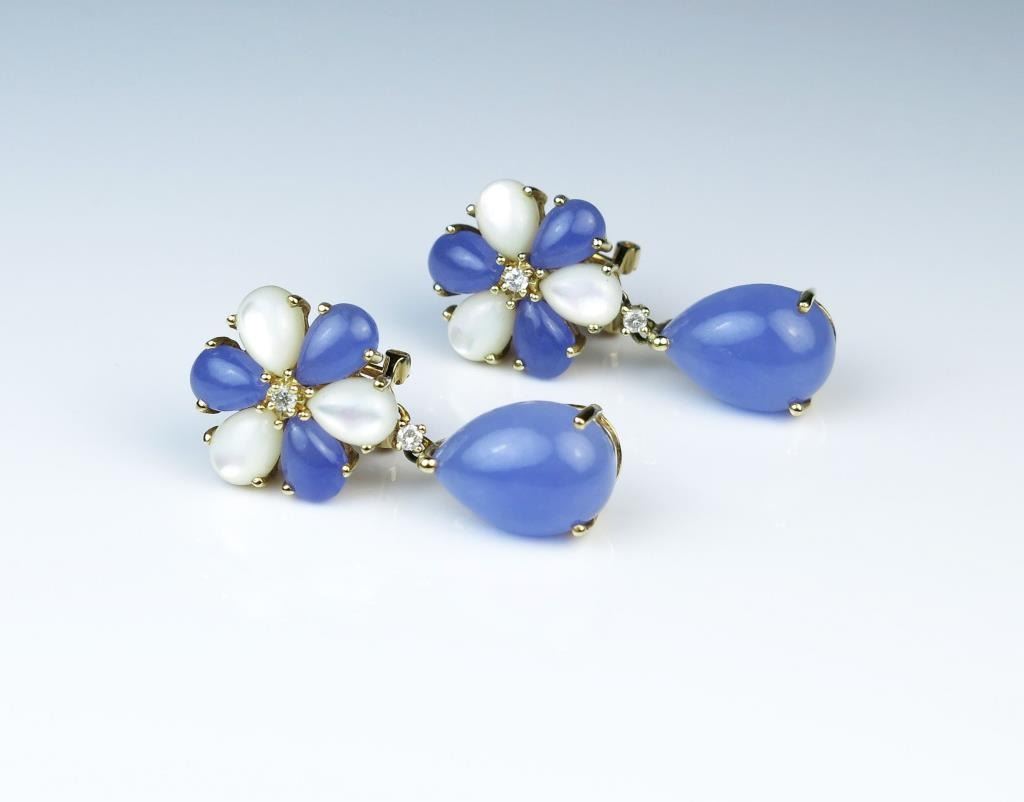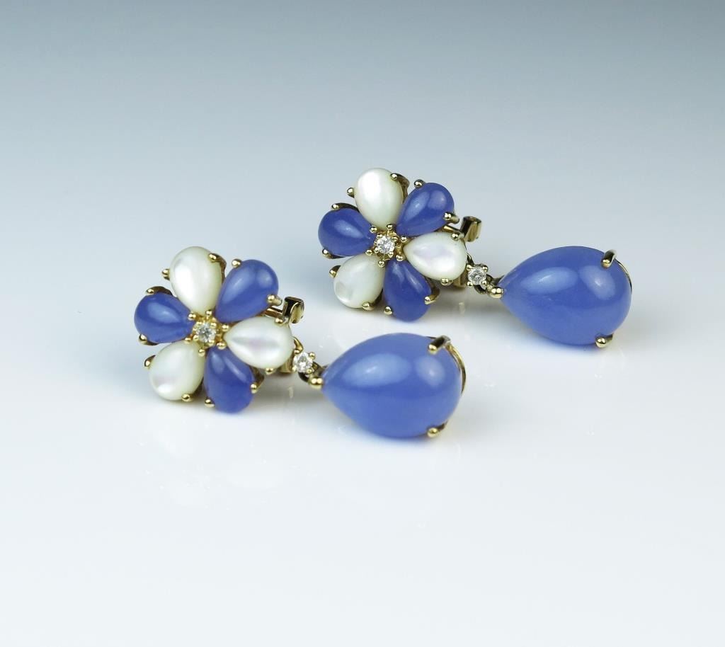 Irresistible Lavender Jade, Mother of Pearl and Diamond drop style earrings Jade weight approx. 15.00 carats with 4 small Diamonds and Mother of Pearl accents set in 14 karat yellow gold. Retail $2,500-$3,500 Estimates$1,200-$1,800