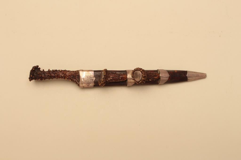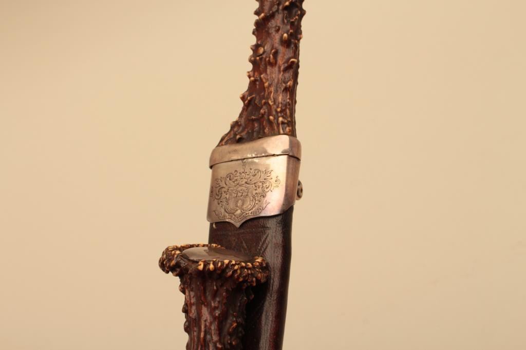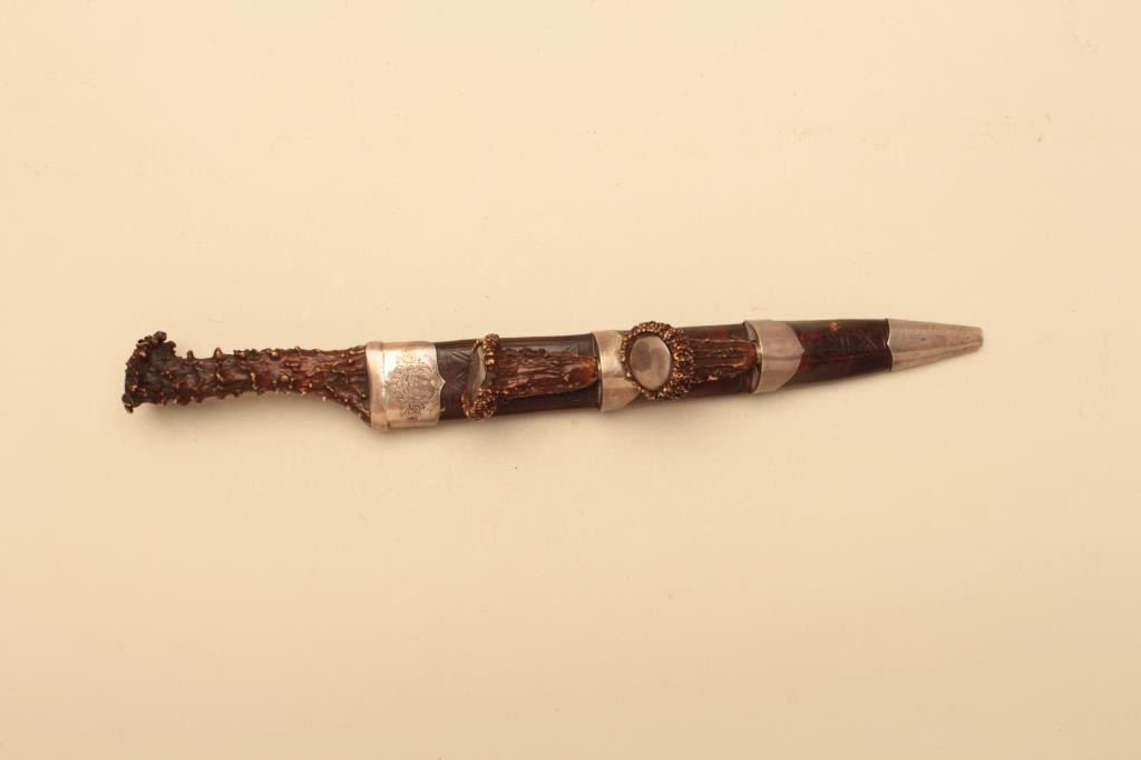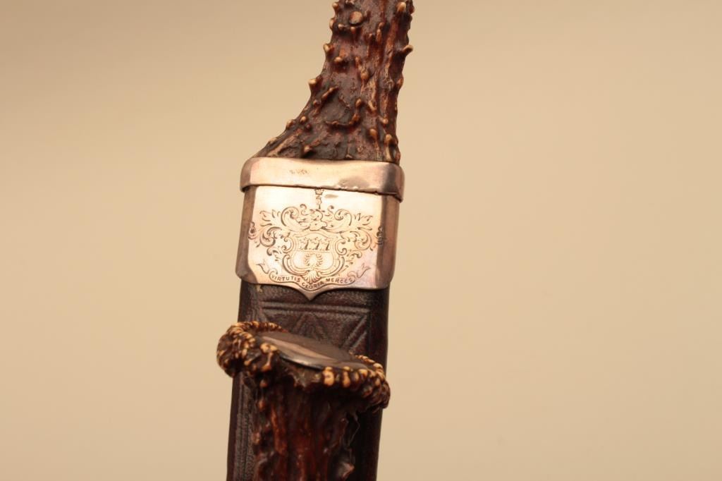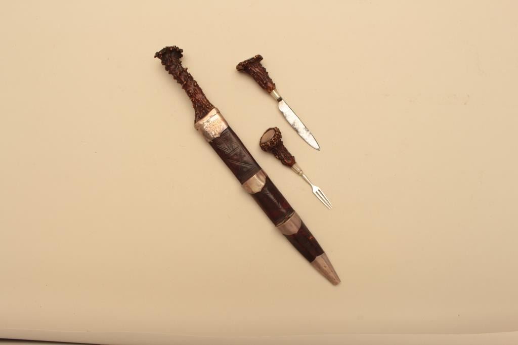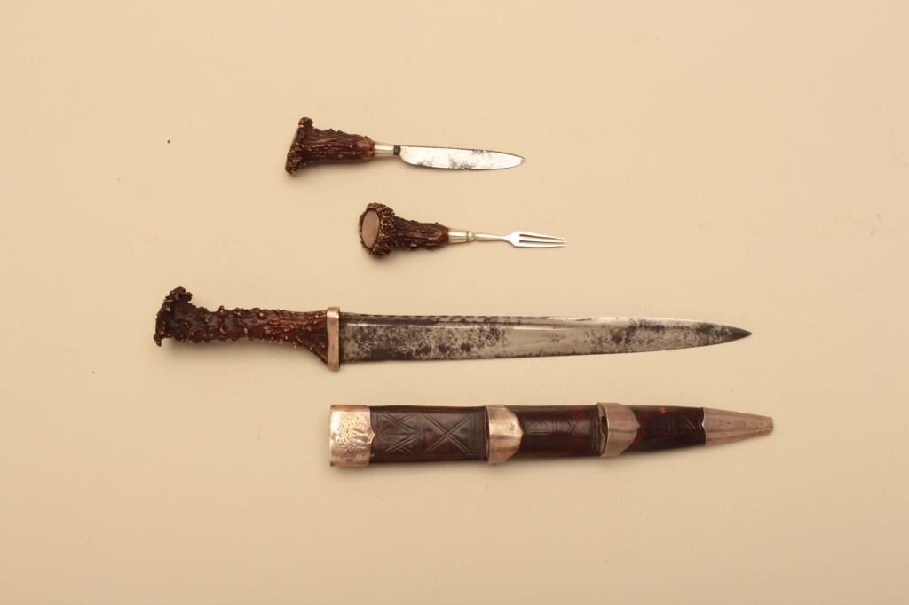 Fine Scottish Dirk with silver mounting and stag horn grips. 19th century showing identifiable crest hand engraved on throat of scabbard. Measures 16 ½” overall with a 10 7/8” blade. Matching Trousse (Knife & Fork).The blade shows some pitting and use and may be earlier than mountings as thrifty Scotts never threw a good blade. The grips and scabbard are very good plus. Est.: $2000-$4000