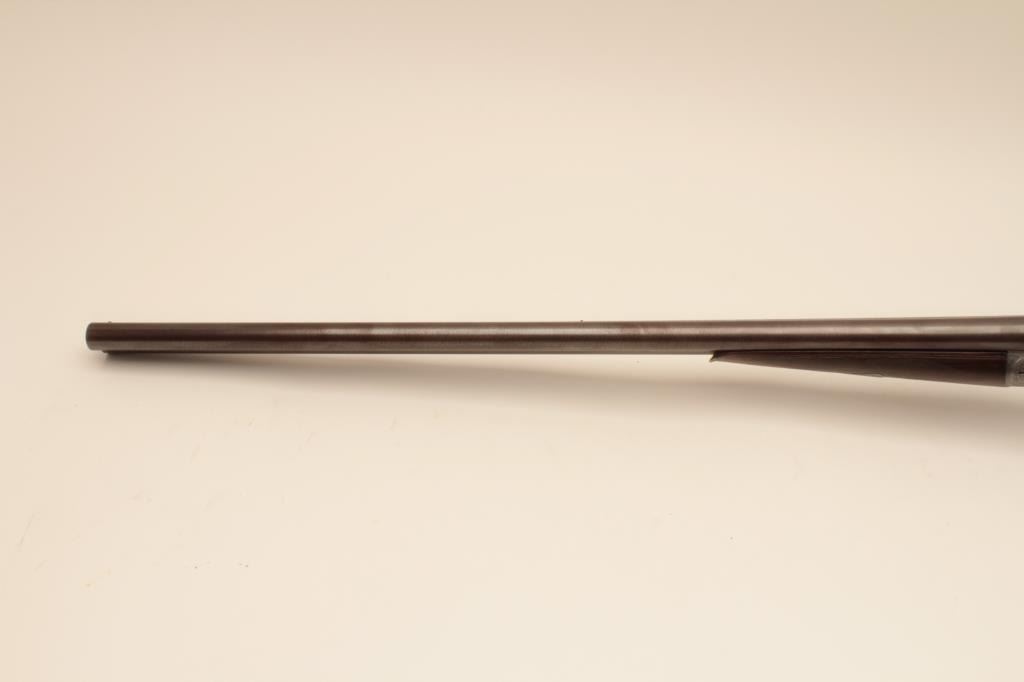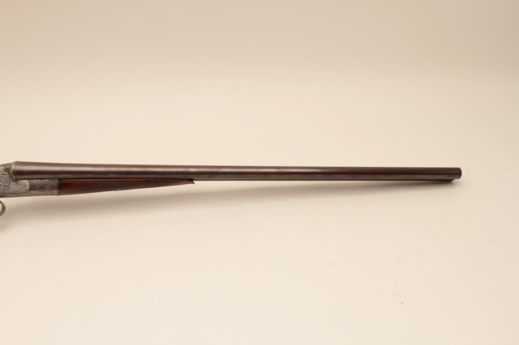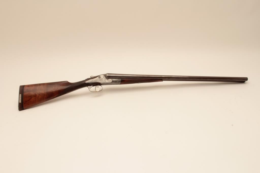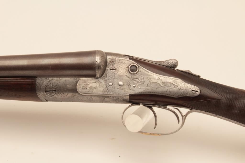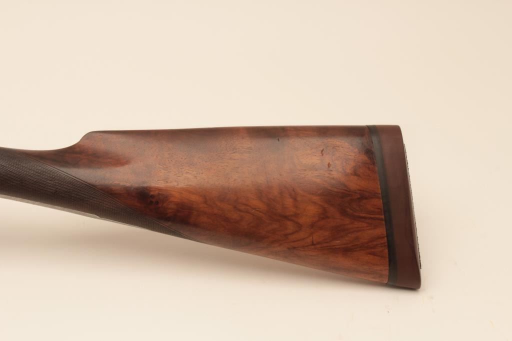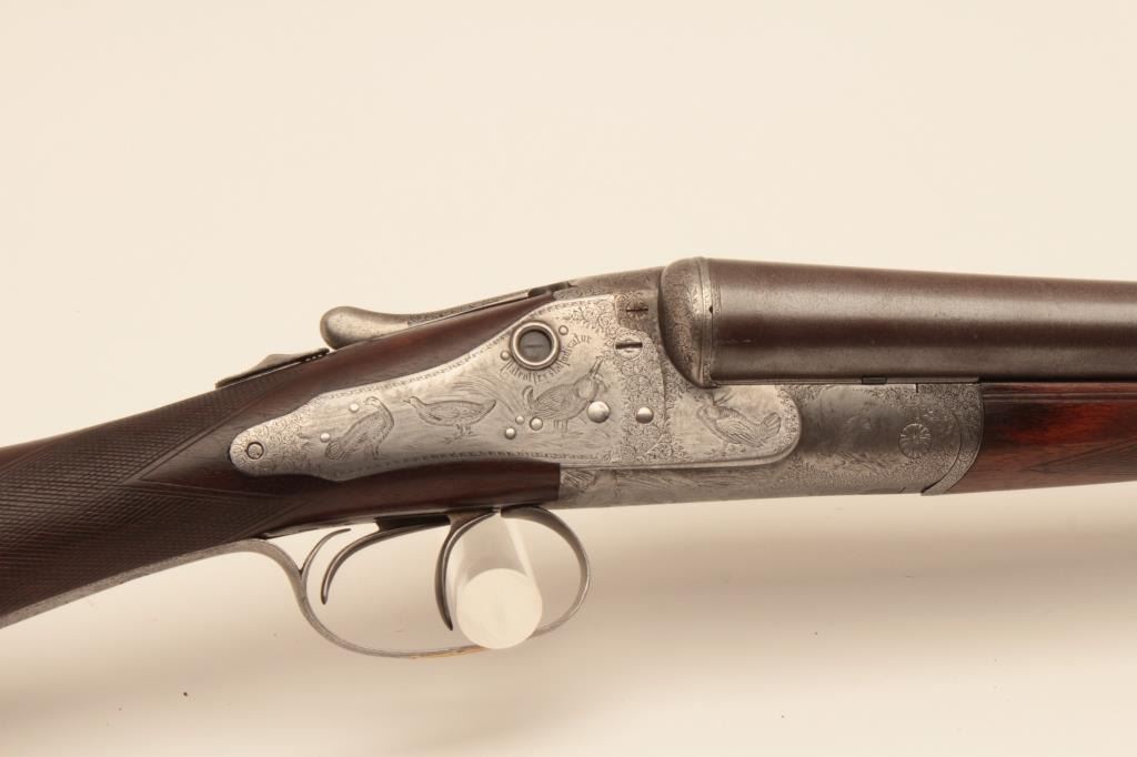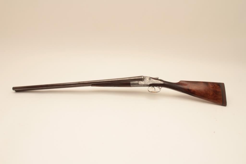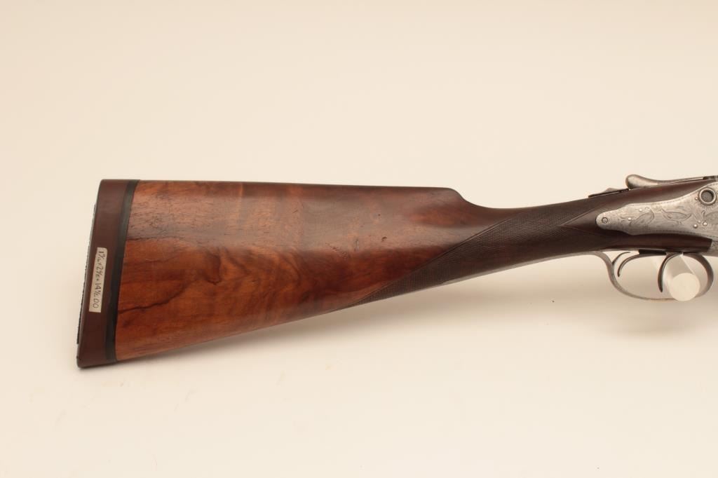 W&C Scott “Premier” grade 12GA SxS shotgun with Damascus barrels, S/N 34807. Marked “Patented Triplex Lever Grip”. On the rib with address and grade. Showing elaborate scrolls with fancy gold initials on thetrigger guard. Also shows patent crystal indicators on the locks. The barrels measure 28” with full set of Briley chokes fitted and included. The barrels show most original brown and patterning with rust and erosion.The frame and locks are light silvery gray with crisp engraving. Locks tight with good bores. Shows black powder proofs. The stocks are good with even wear and aging. Measures 14 ¼” to the end of thick rubber pad. Plastic hard shell carry case included. (Antique) Est.: $1500-$3000