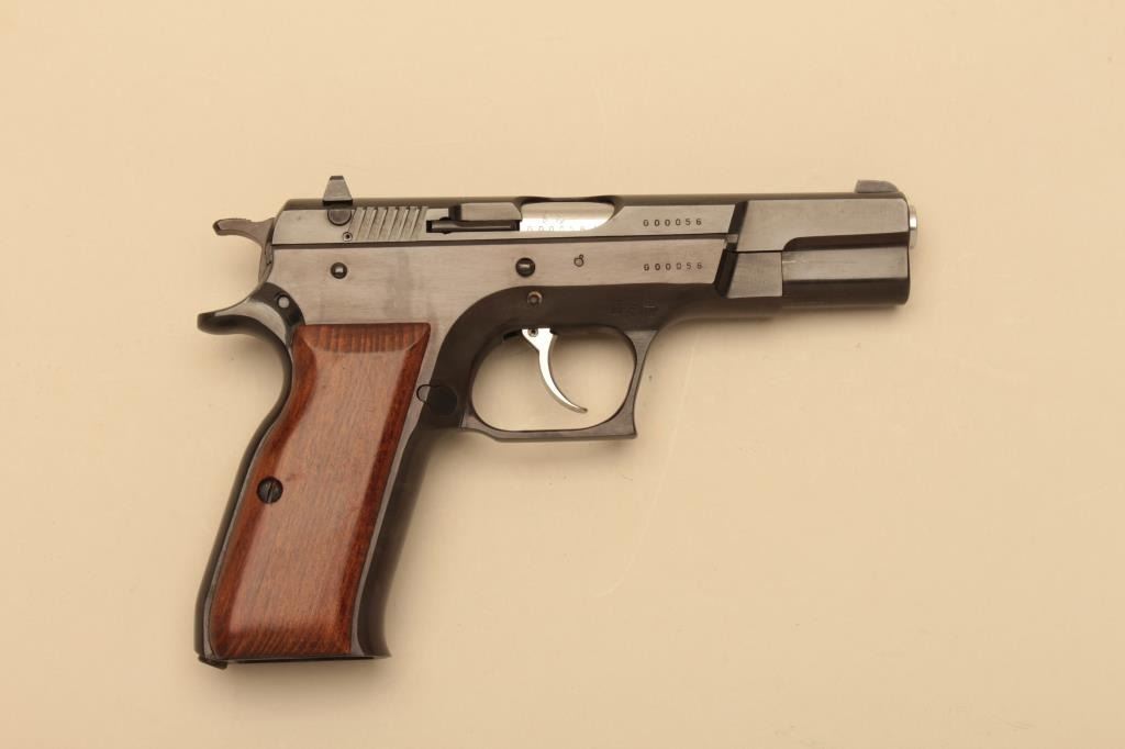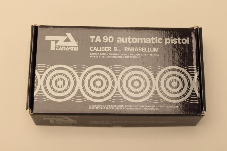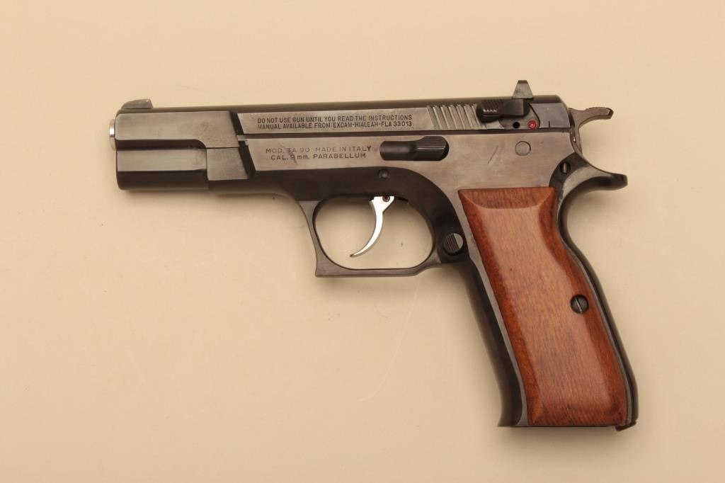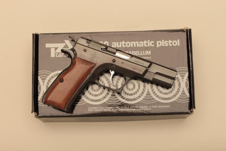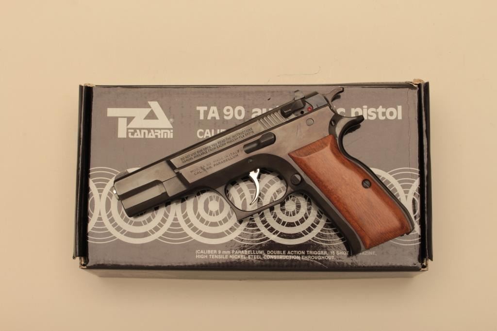 Tanfoglio Model TA90 semi automatic pistol, #G00056, 9mm, 4 1/2" barrel, blued finish, fixed sights, smooth wood grips. Pistol is in fine condition overall, retaining 96-98% original finish, showing minimal marks fromuse. Grips are fine, bore is excellent. Includes original box, instructions and one hi-cap mag (not transferrable to CA or other prohibited states or areas). (Modern/PPT) Est. $250-500