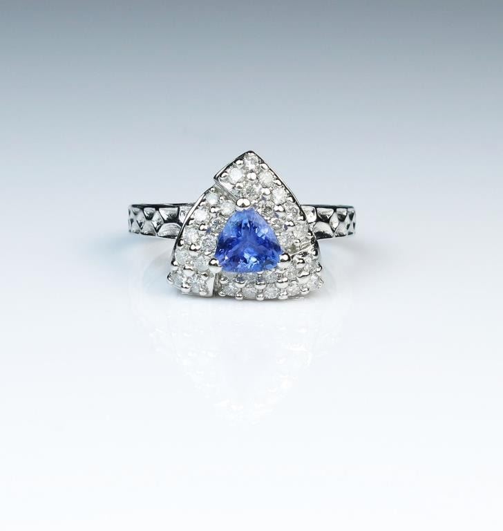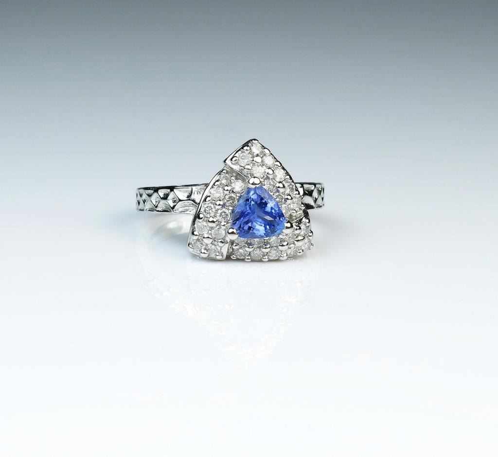 Tantalizing Tanzanite and Diamond ring featuring a trilliant cut Tanzanite weighing approx. 1.00 carat framed with a boarder of 30 full cut Diamonds weighing approx. 0.80 carats with G-H colors and SI clarity set in14 karat white gold setting. Retail $1,800-$2,500 Estimates $900-$1,500