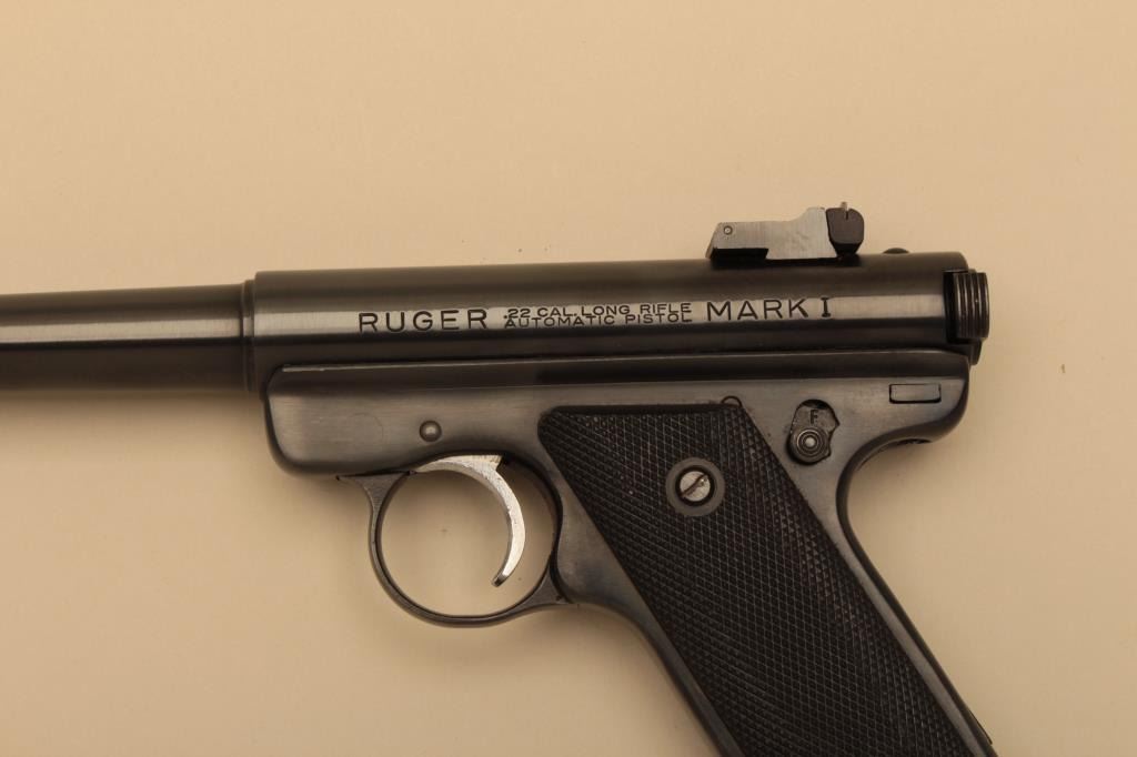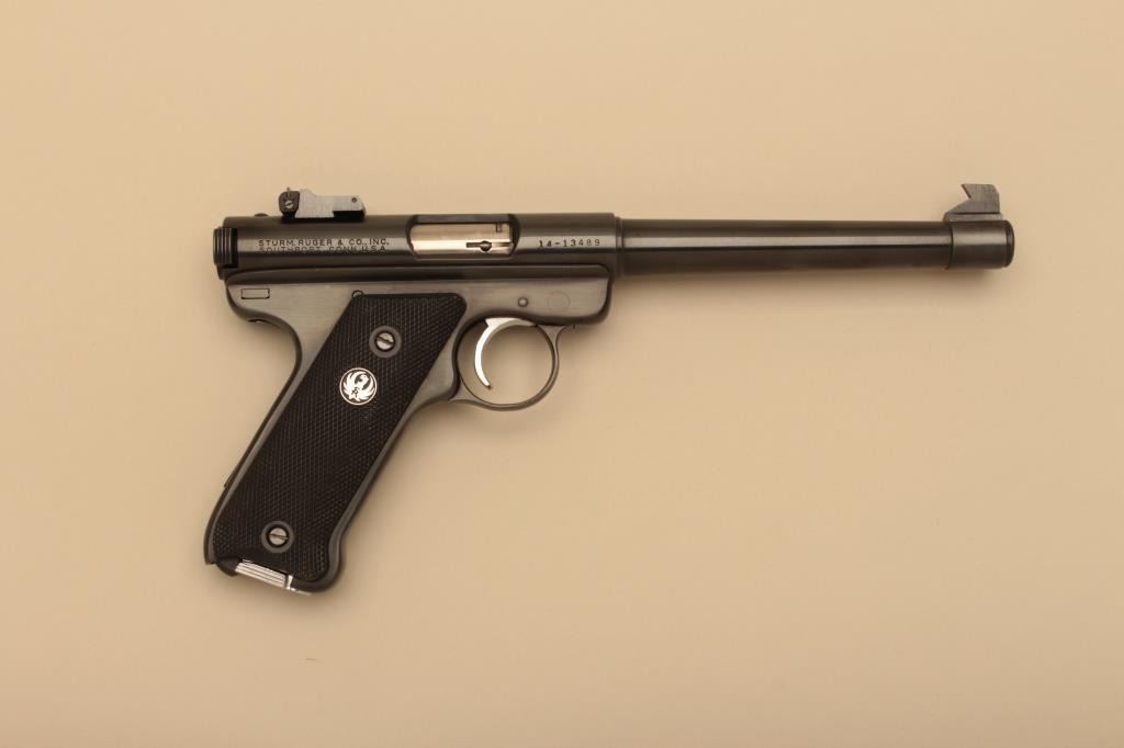 Ruger Mark I semi automatic pistol, #14-13489, .22 LR, 6 7/8" tapered heavy barrel, blued finish, adjustable sights, checkered medallion grips. Pistol is in fine condition overall, showing 95%+ originalfinish, very good bore and action. Chamber and action are in need of a good cleaning. Grips are fine with no chips or cracks. Includes one mag. (Modern/PPT) Est. $300-600