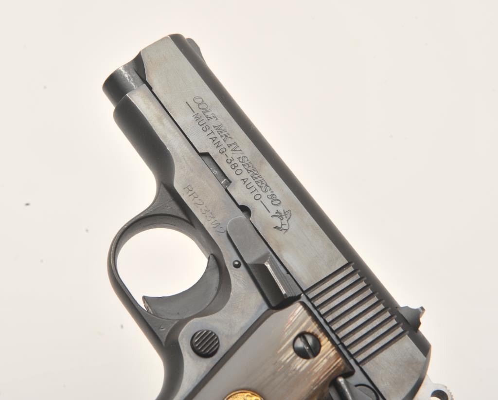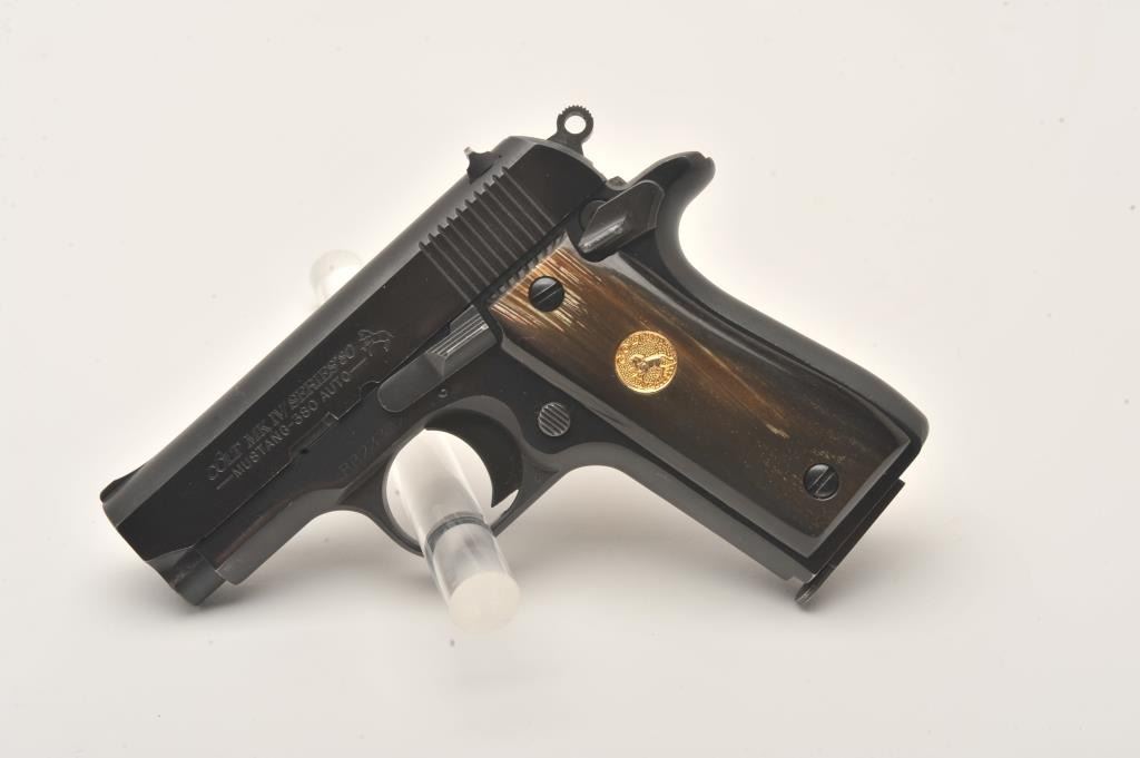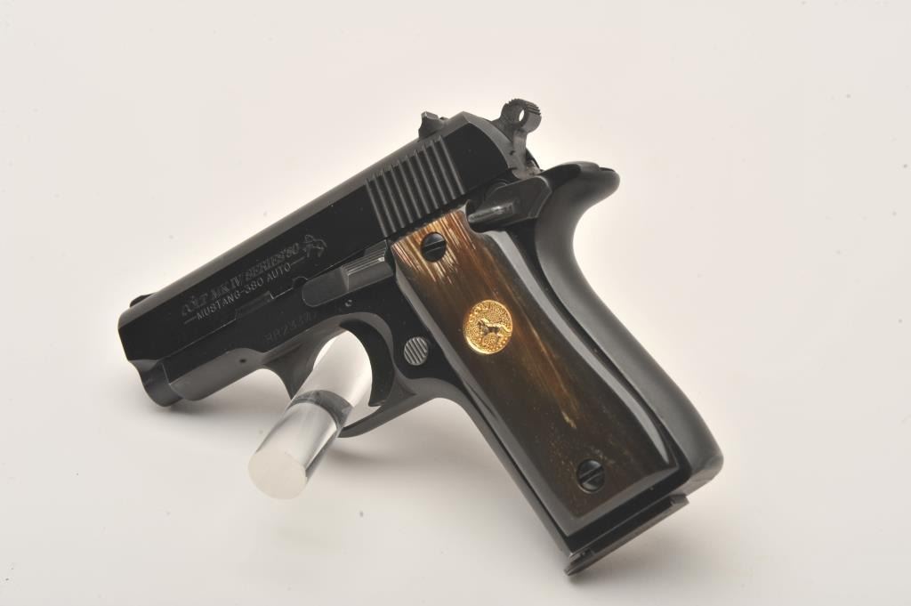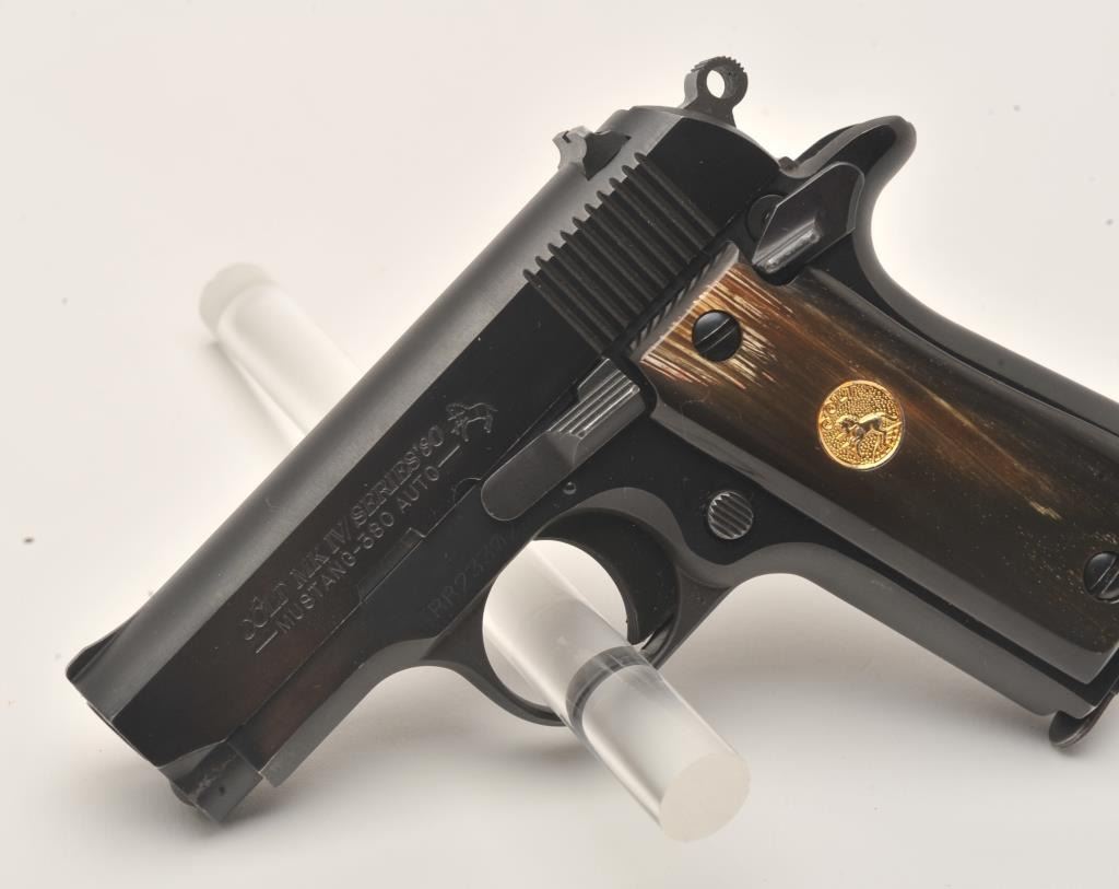 Colt MK IV/Series 80 Mustang Plus II semi-automatic pocket pistol, .380 caliber, 2.75” barrel, blued finish, smooth Ox horn medallion grips, S/N RR23302, in factory blue plastic carry case with one extra magazineand original checkered black medallion pair of grips; overall excellent condition showing little if any use. (Modern/PPT). Est.: $500-$1,000.