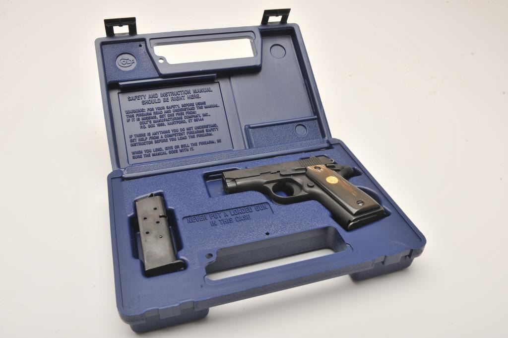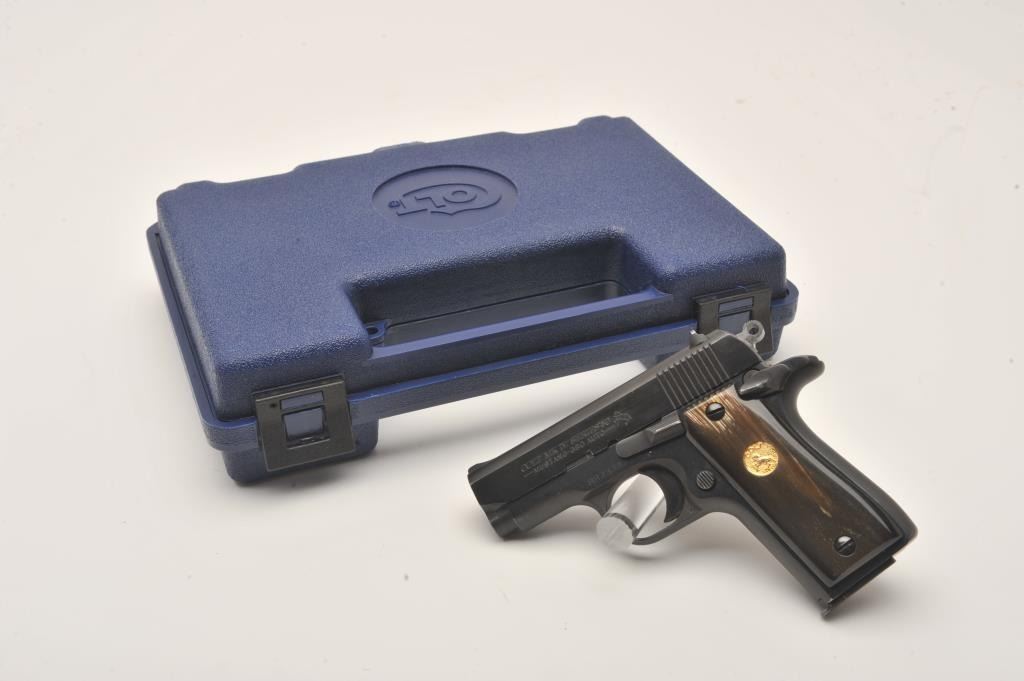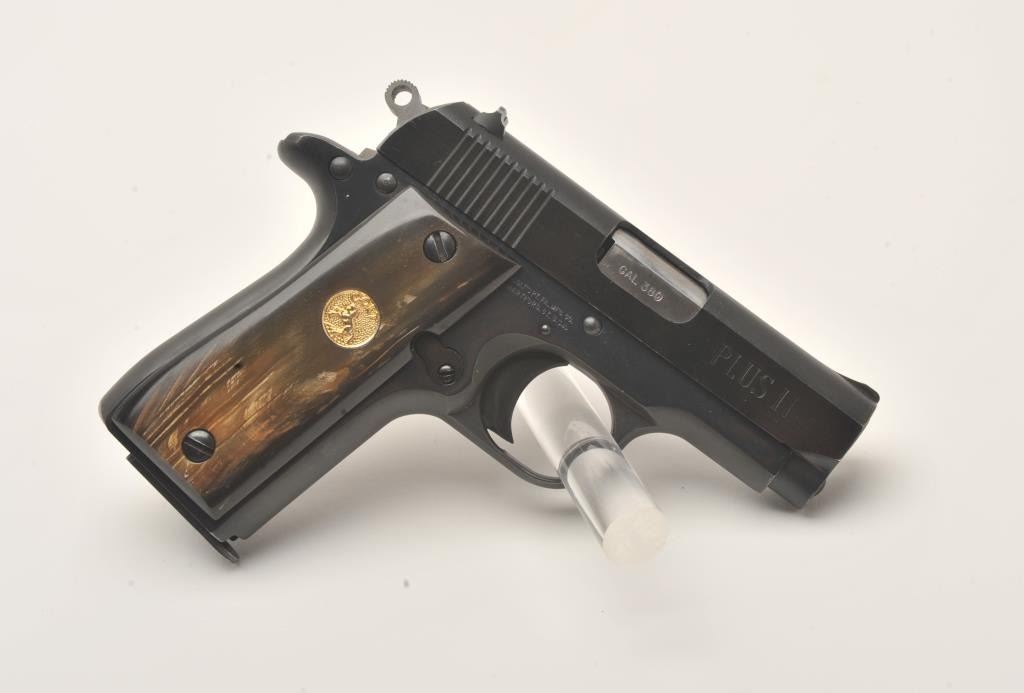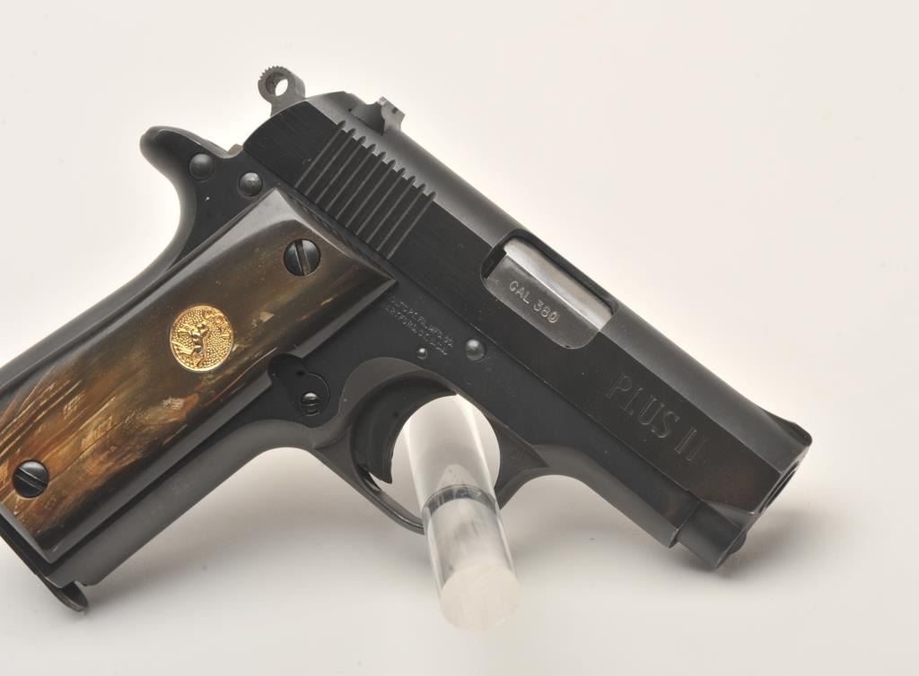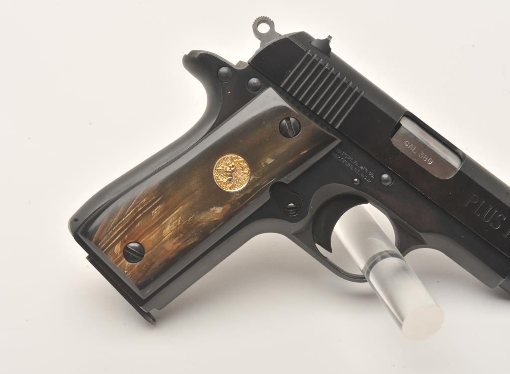 Colt MK IV/Series 80 Mustang Plus II semi-automatic pocket pistol, .380 caliber, 2.75” barrel, blued finish, smooth Ox horn medallion grips, S/N RR23302, in factory blue plastic carry case with one extra magazineand original checkered black medallion pair of grips; overall excellent condition showing little if any use. (Modern/PPT). Est.: $500-$1,000.