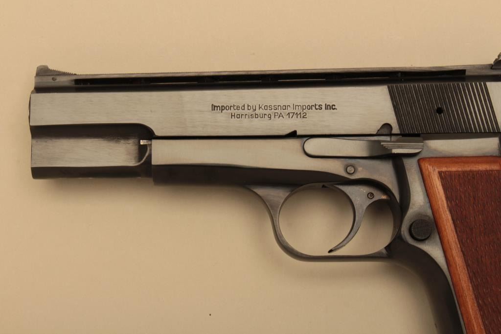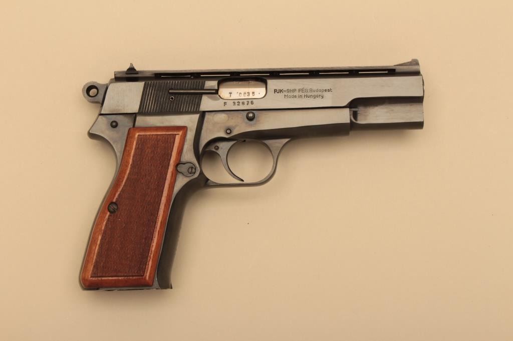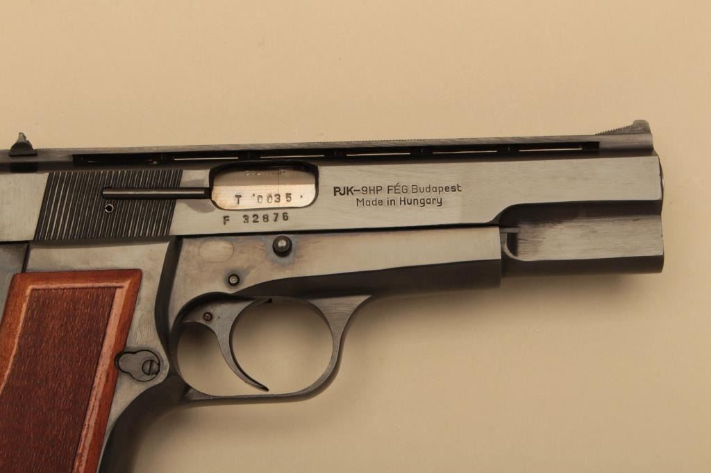 FEG Model PJK-9HP, #F32876, 9mm, 4 5/8" barrel, vent rib on slide, blued finish, checkered wood grips. Pistol is in fine condition, mint bore, crisp action, excellent grips, barrel numbered "T0035". One hi-capmag (not transferrable to CA or other prohibited states or areas). (Modern/PPT) Est. $250-500
