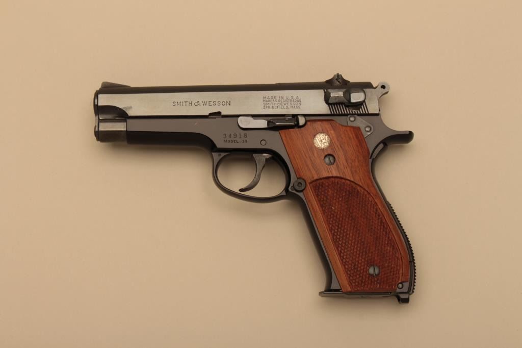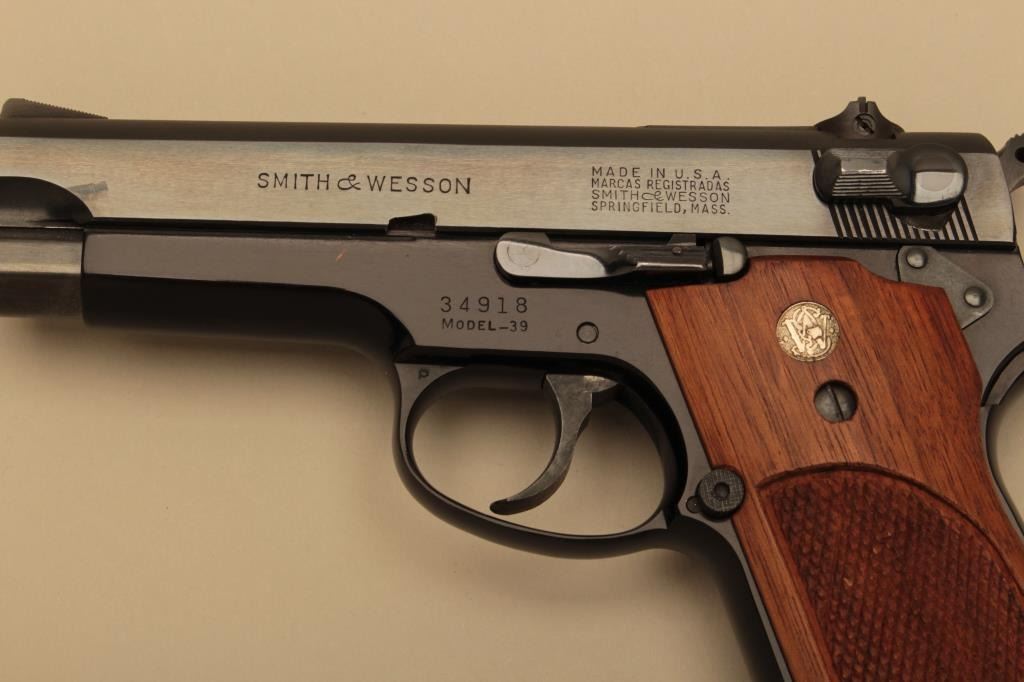 Smith & Wesson Model 39, #34918, 9mm, 4" barrel, blued finish, adjustable sights, checkered medallion walnut grips. Pistol is in fine condition overall, showing 95-98% original finish, mint bore, excellent action, grips are fine with no chips or cracks and have crisp checkering. Minor scratches on the right side of the safety switch. Hard to improve upon, and deserving of a box. One mag. (C&R/PPT) Est. $250-500