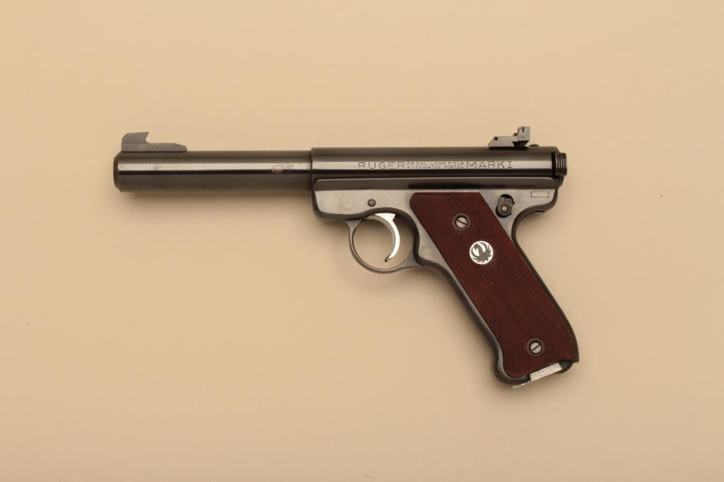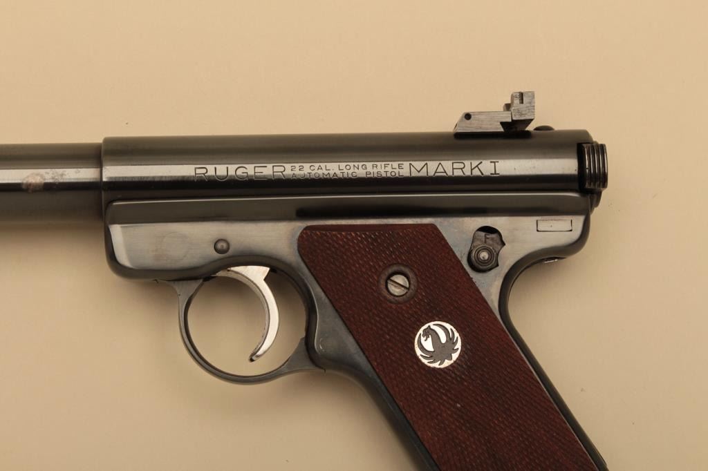 Ruger Mark I semi automatic pistol, #309151, .22 LR, 5 1/2" bull barrel, blued finish, adjustable sights, checkered walnut medallion grips. Pistol is in near fine condition overall, showing 90-95% original finish, very good bore and action. Grips are fine with no chips or cracks. One mag. (Modern/PPT) Est. $200-400