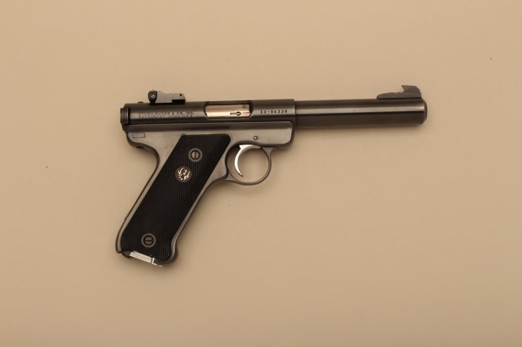 Ruger Mark I semi automatic pistol, #13-84336, .22 LR, 5 1/2" bull barrel, blued finish, adjustable sights, checkered medallion grips. Pistol is in near fine condition overall, showing 90-95% originalfinish, very good bore and action. Grips are fine with no chips or cracks. One mag. (Modern/PPT) Est. $200-400