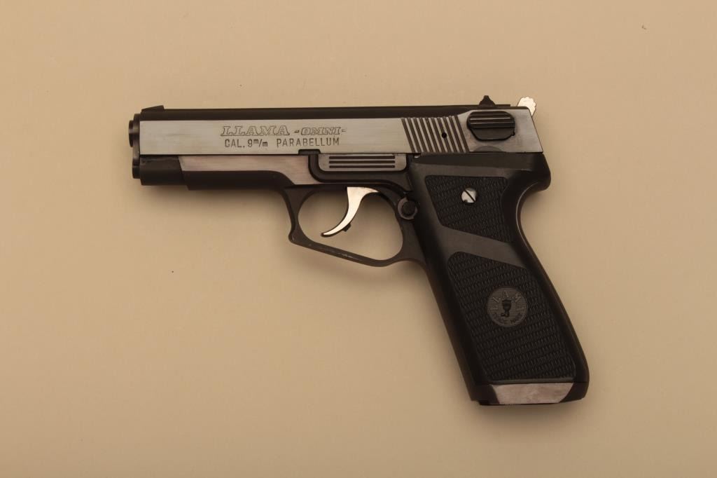LLama Omni semi automatic pistol, #PA2937, 9mm, 4 1/4" barrel, blued finish, checkered plastic logo grips. Pistol is in fine condition overall, retaining the majority of it's original finish. Bore and action areexcellent. One hi-cap mag (not transferrable to CA or other prohibited states or areas). (Modern/PPT) Est. $300-600