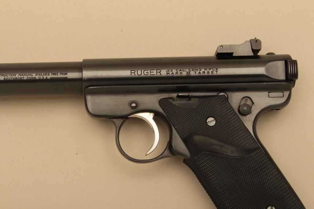 Ruger Mark II Target semi automatic pistol, #18-99533, .22 LR, 5 1/2" bull barrel, blued finish, adjustable sights, Pachmayr grips. Pistol is in near fine condition overall, showing 93-95% original finish, very goodbore and action. One mag. (Modern/PPT) Est. $250-500