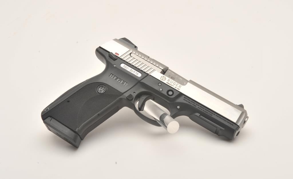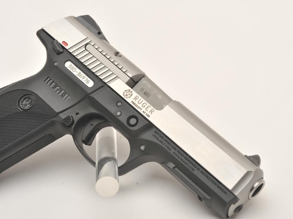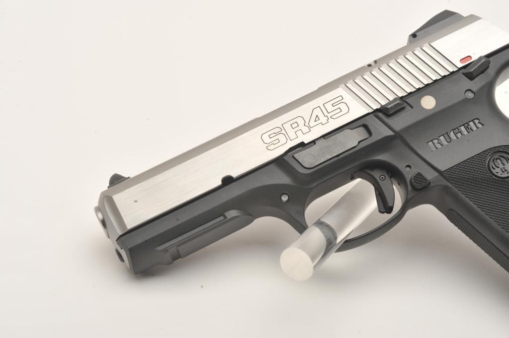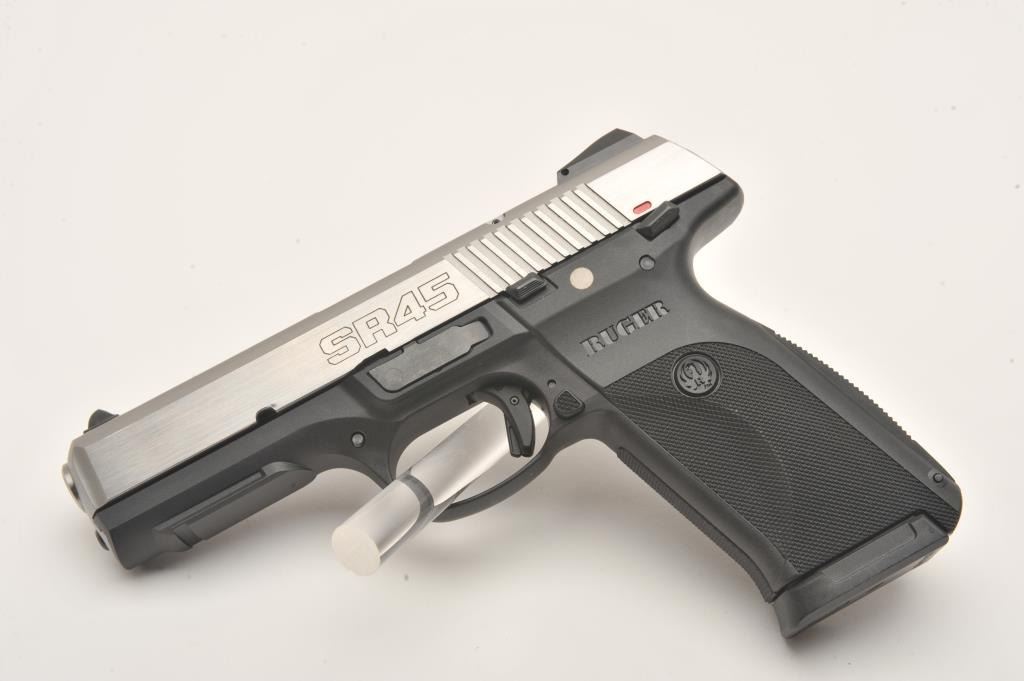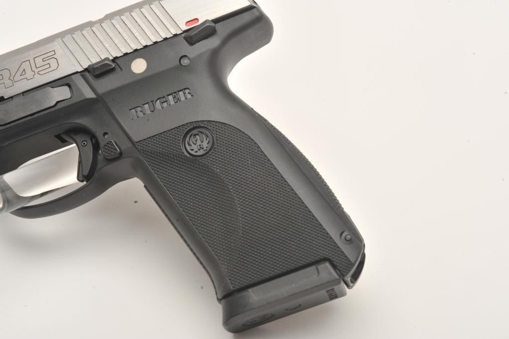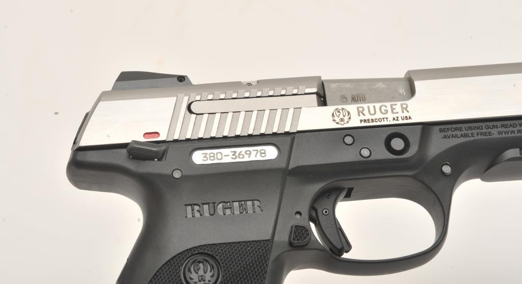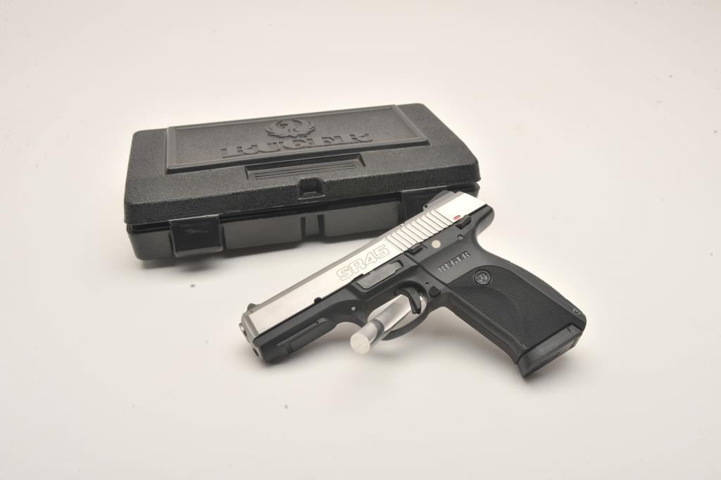 Ruger Model SR45 semi-automatic pistol, .45 Auto caliber, 4.5” barrel, mat black frame with finely checkered black integrated grips, polished stainless slide, with factory hardcase, one extra magazine and instructions manual, S/N 380-36978; like new condition. (Modern/PPT). Est.: $300-$600.