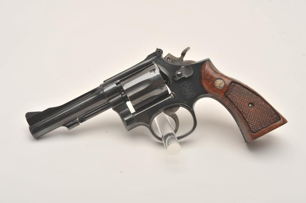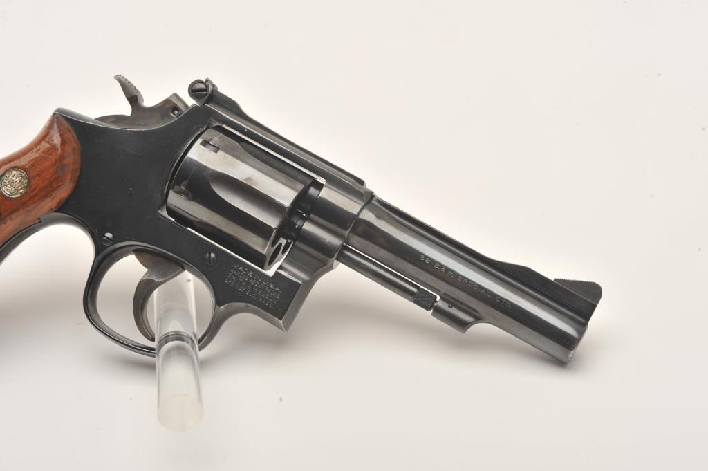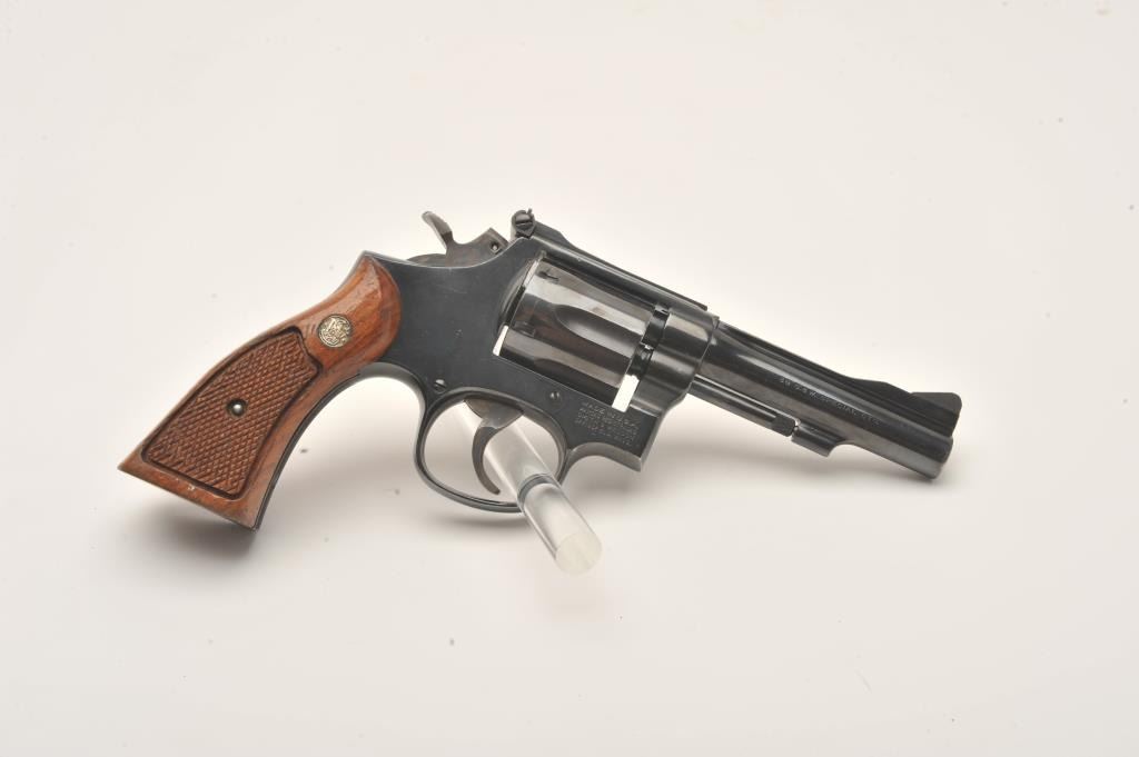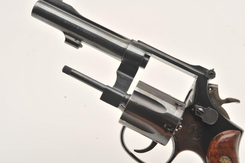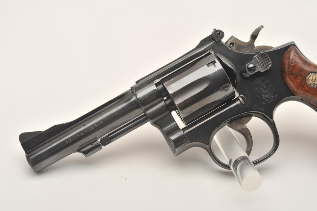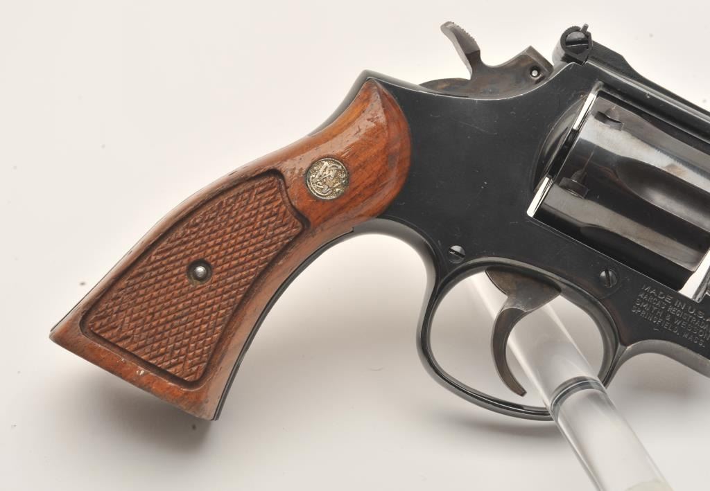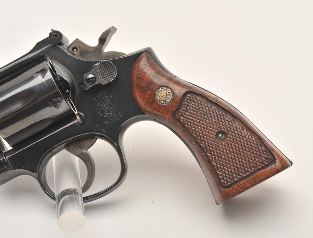 Smith & Wesson Model 15-4 DA revolver, .38 Special caliber, 4” barrel, blued finish” checkered wood medallion grips, S/N ACW4982, overall fine condition showing majority of original finish, some light high point wear,fine bore, crisp acti3801on, sharp markings and fine grips. (Modern/PPT). Est.: $250-$500.