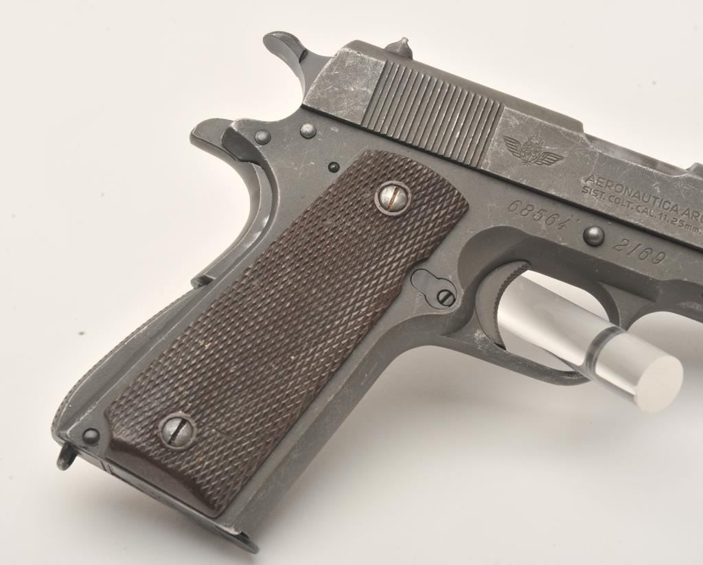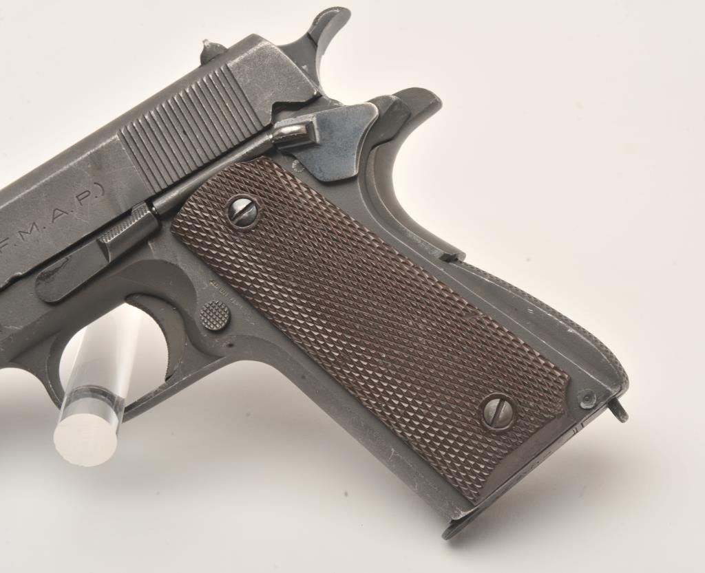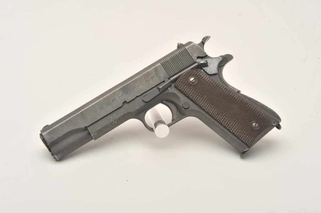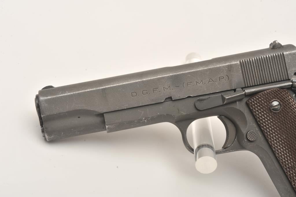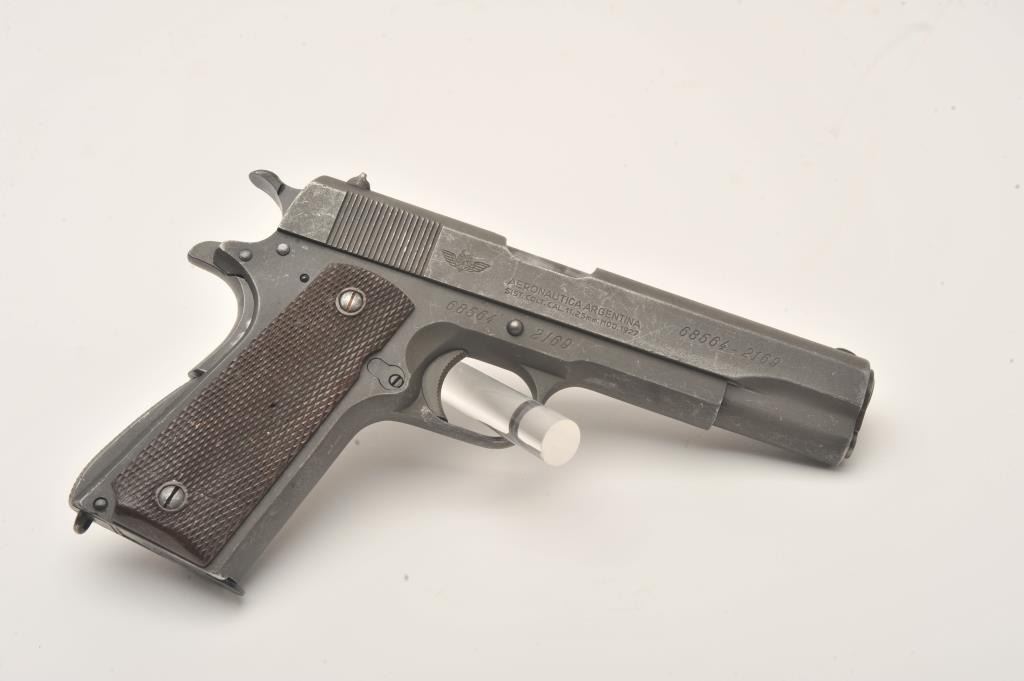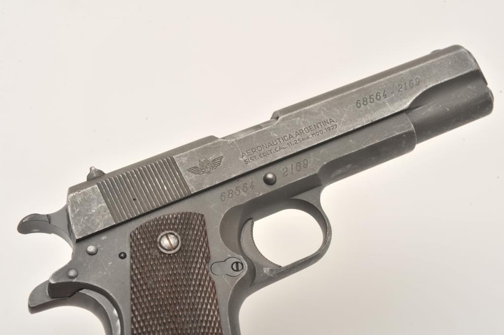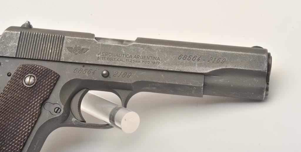 Scarce D.G.F.M.-F.M.A.P. Model 1927 Sistema Colt Argentine Air Force semi-automatic pistol, .45 caliber, 5” barrel, parkerized finish, brown plastic checkered grips, S/N 68564 – (2169), all matching visible numbers(unmarked barrel); import marked, overall very good condition with a very good to fine bore, crisp action, very good markings and very good grips. Note included from consignor indicates pistol was ordered by the Argentine Air Force and was given the issue number of 2169 out of 4285 ordered. Additionally, consignor notes pistol is part of a block of 250 pistols shipped Feb. 20, 1953, that the pistol was originally bluedbut was at some point parkerized and had its grips changed at the Argentine arsenal. (C&R). Est.: $300-$600.