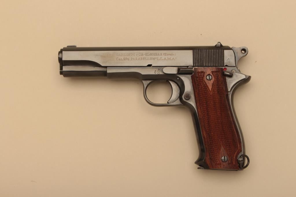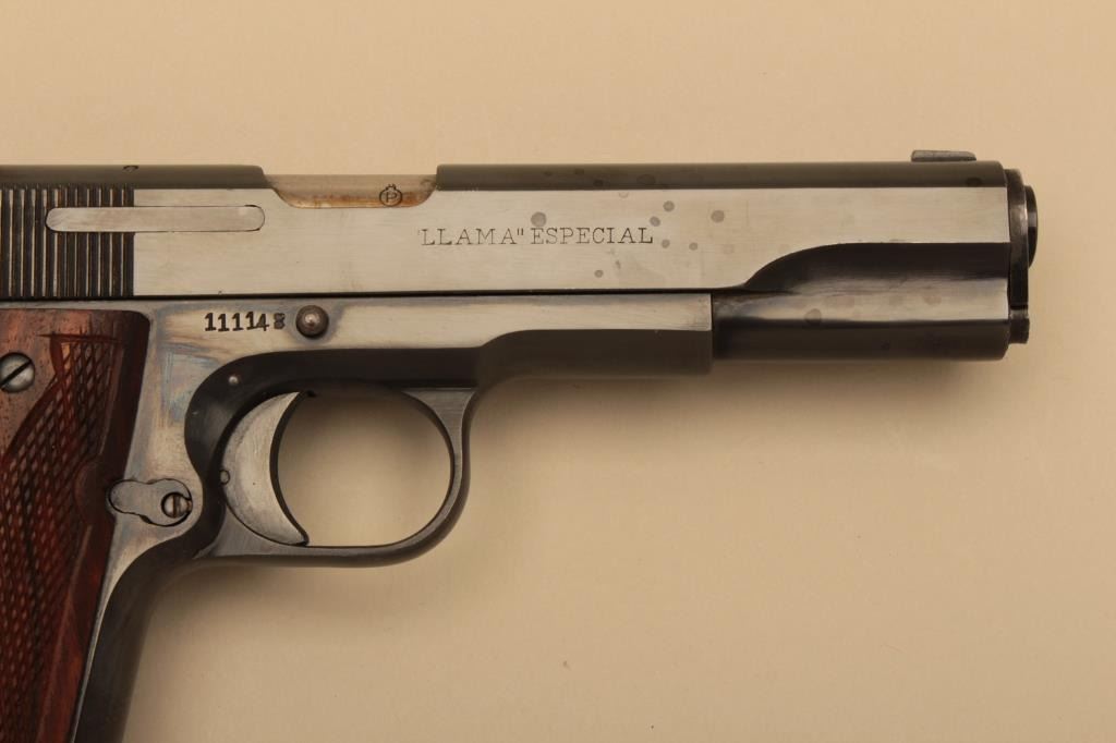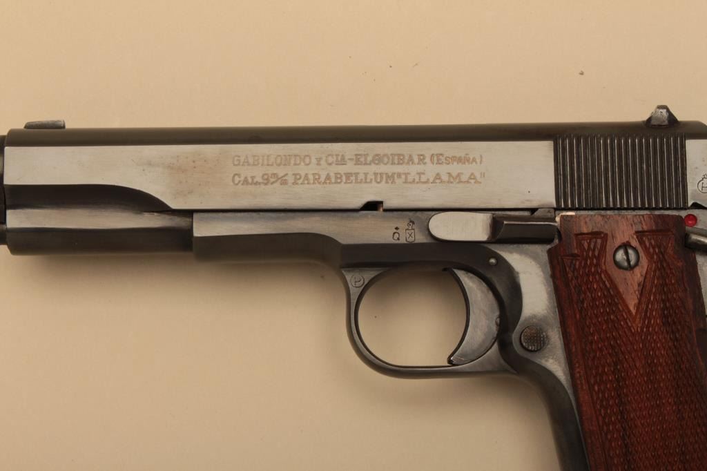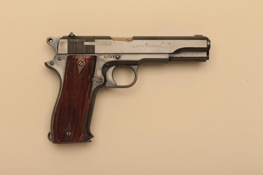 Early Llama Especial Model XI, #111148, 9mm Parabellum, 5" barrel, blued finish, checkered wood grips. Pistol is in fine condition, over 95% original finish remains, very good action and bore, grips are fine(possibley replacement). One mag. (C&R/PPT) Est. $250-500