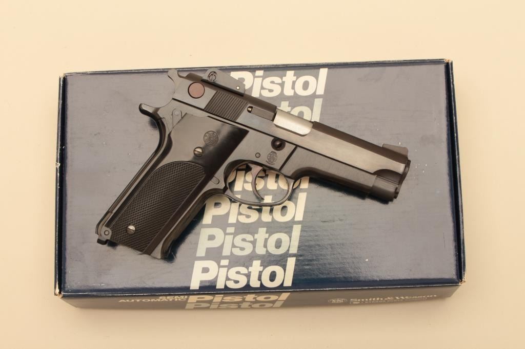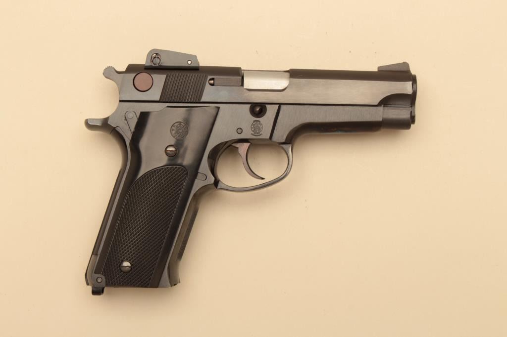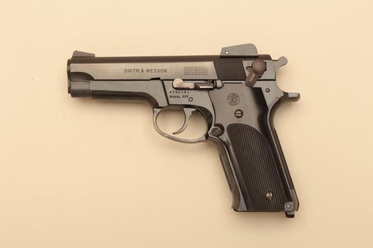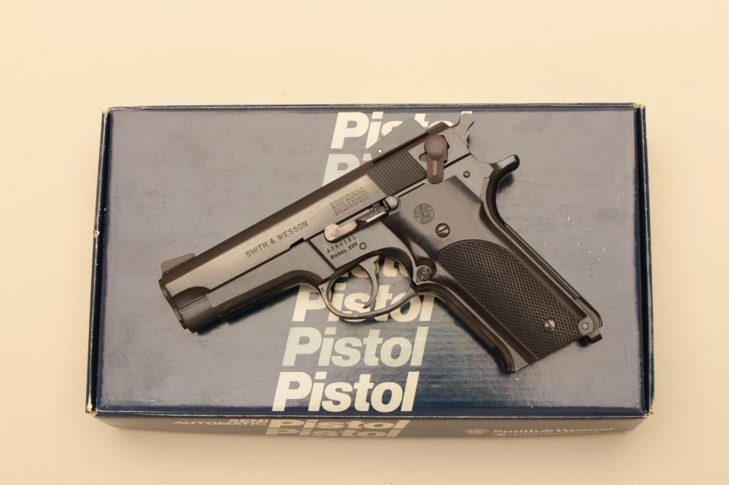 Smith & Wesson Model 559, #A750151, 9mm, 4" barrel, blued finish, adjustable sights, checkered medallion plastic grips. Pistol is in fine condition overall, showing 95-98% original finish, mint bore, excellent action, grips are fine with no chips or cracks and have crisp checkering. Minor handling marks. Includes box, instructions and 2 hi-cap mag (not transferrable to CA or other prohibited states or areas). (Modern/PPT) Est.$400-800