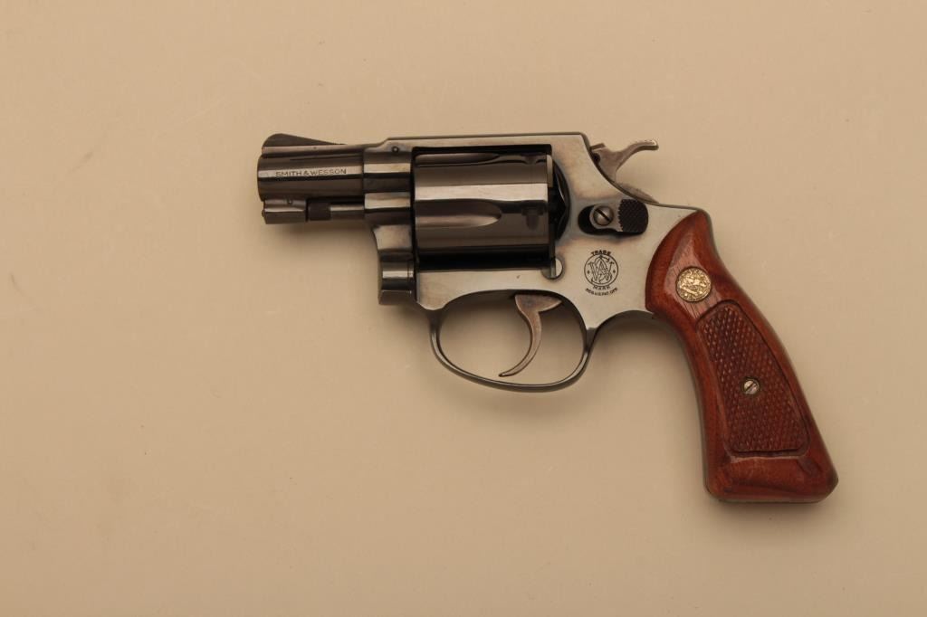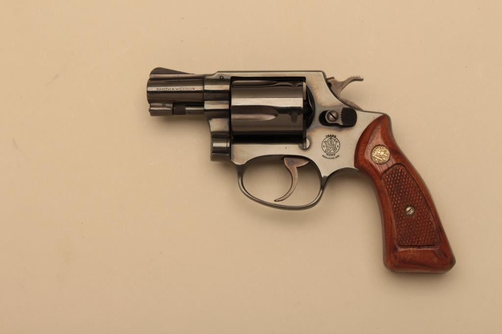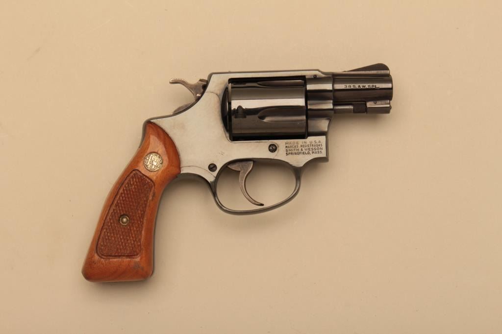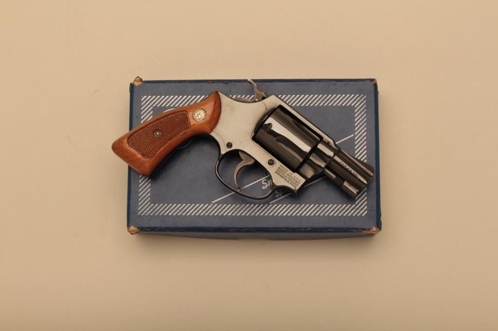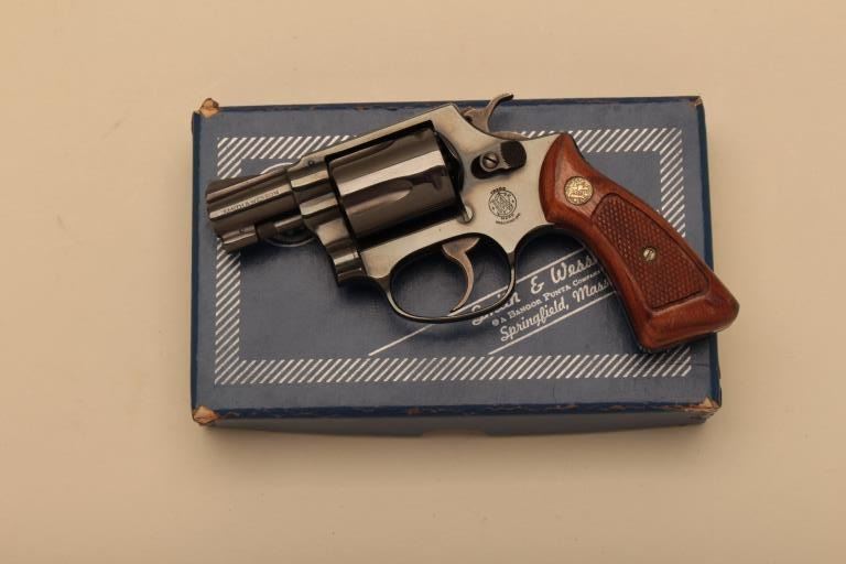 Smith & Wesson Model 36 (no dash) DA revolver, .38 Special caliber, 2” barrel, blued finish, checkered wood medallion grips, S/N J245043; in like new condition with factory two piece cardboard box.(Modern/NO CAL. SALE). Est.: $400-$800.