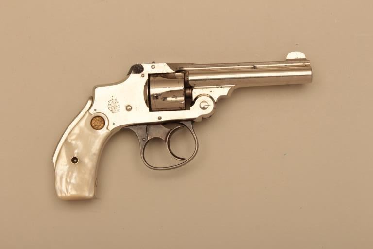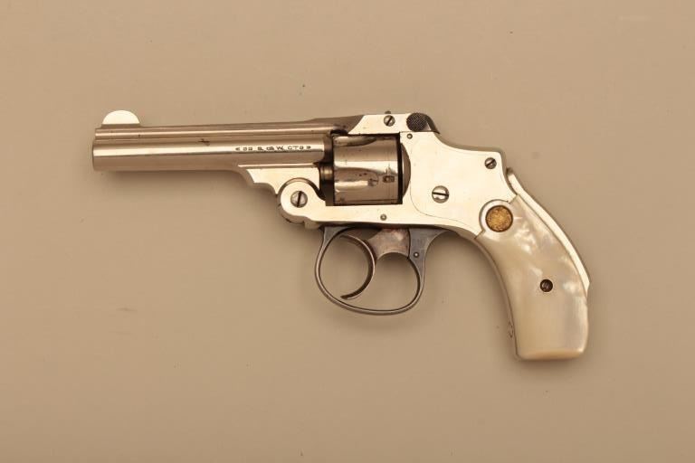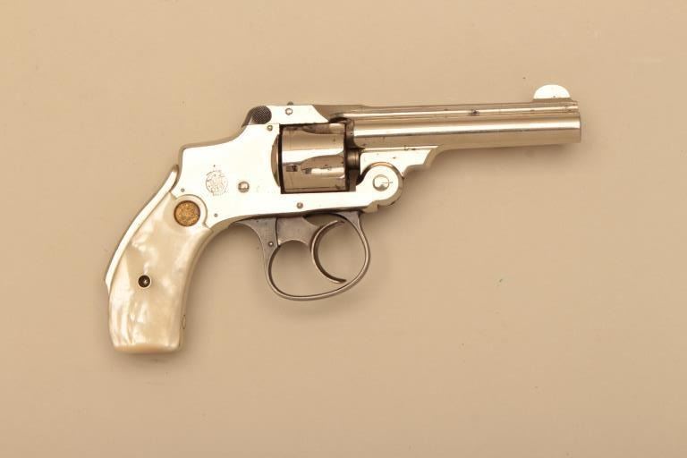 Smith & Wesson New Departure Safety Third Model DA revolver, .32 S&W caliber, 3.5” barrel, nickel finish, S&W gold medallion pearl grips, S/N 182431; overall very good to fine condition with majority of originalfinish remaining, crisp action and markings, fine grips; bore shows some scattered spots of pitting. (C&R). Est.: $400-$800.