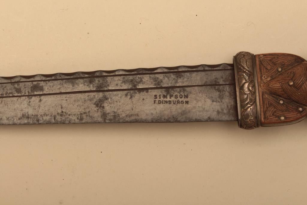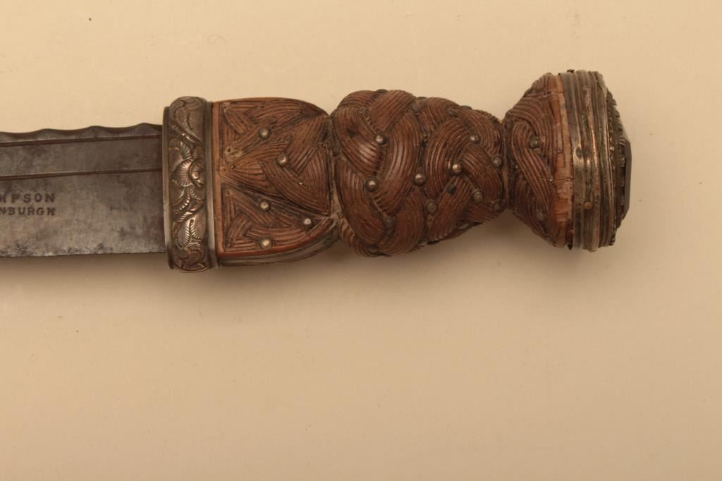 Scottish dagger with carved wood grip and topaz in the butt with blade marked “Simpson, Edinburgh”. No scabbard. The blade shows some pitting and dark patina. About 1830-1850. Measures 16 ½” overall with a 12”blade. Est.: $600-$1200