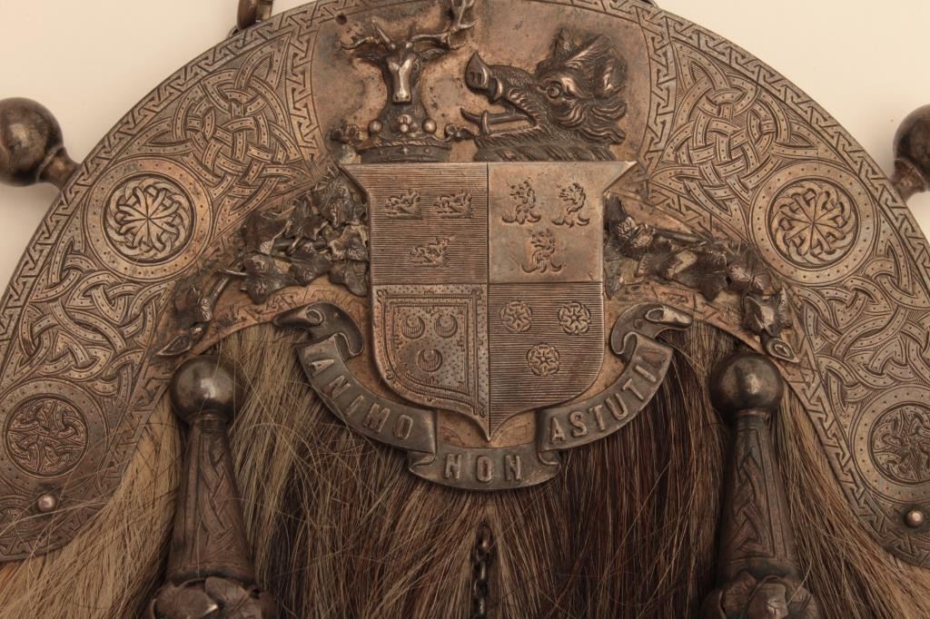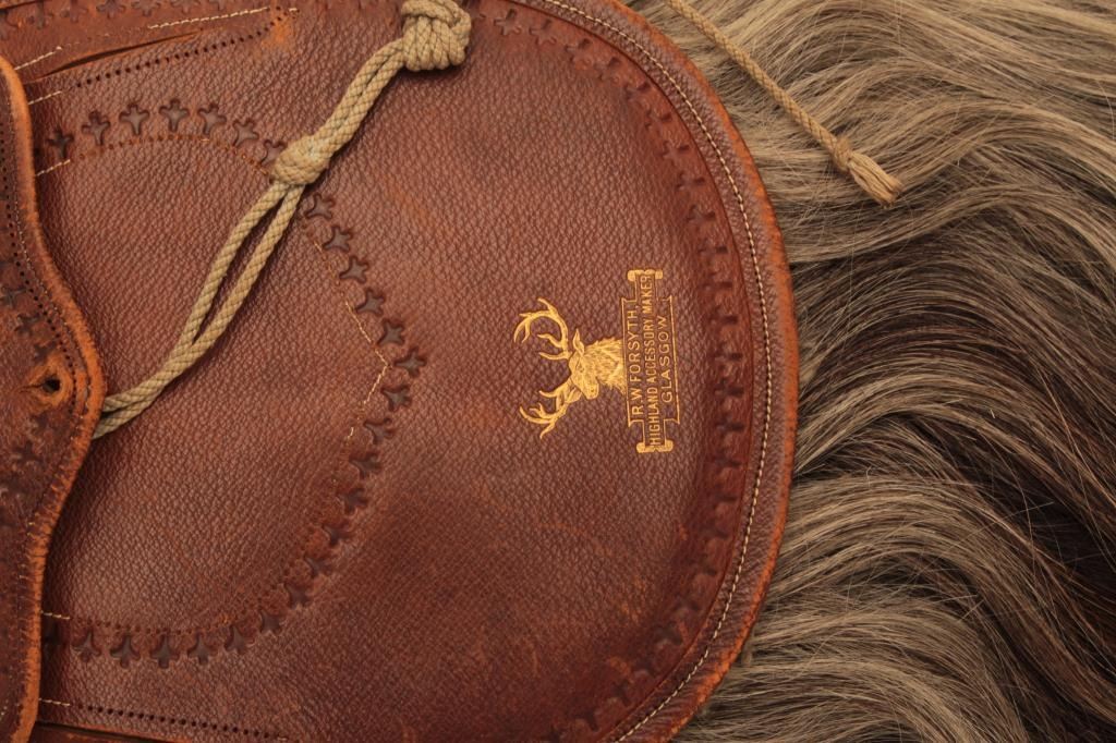 Exceptional silver mounted sporran with relief and engraved silver. Maker marked in leather on back, R.W. for Syth, Highland Accessory Maker, Glasgow”. Measures 18” in length by 7” wide. Fine to excellentcondition. Circa 1890-1920’s. Small loss to horns of stag otherwise almost fine condition. Est.: $1000-$2000