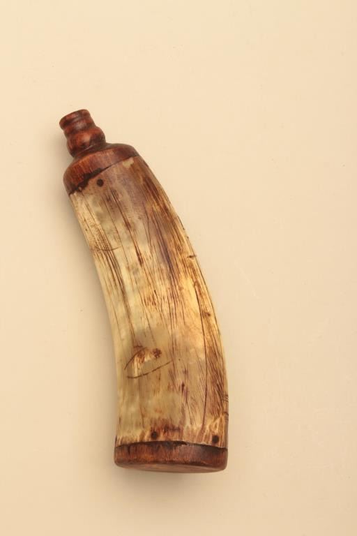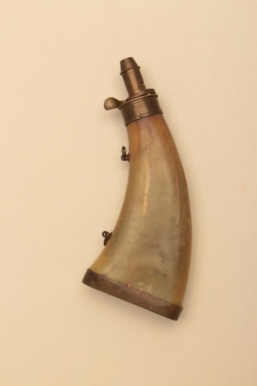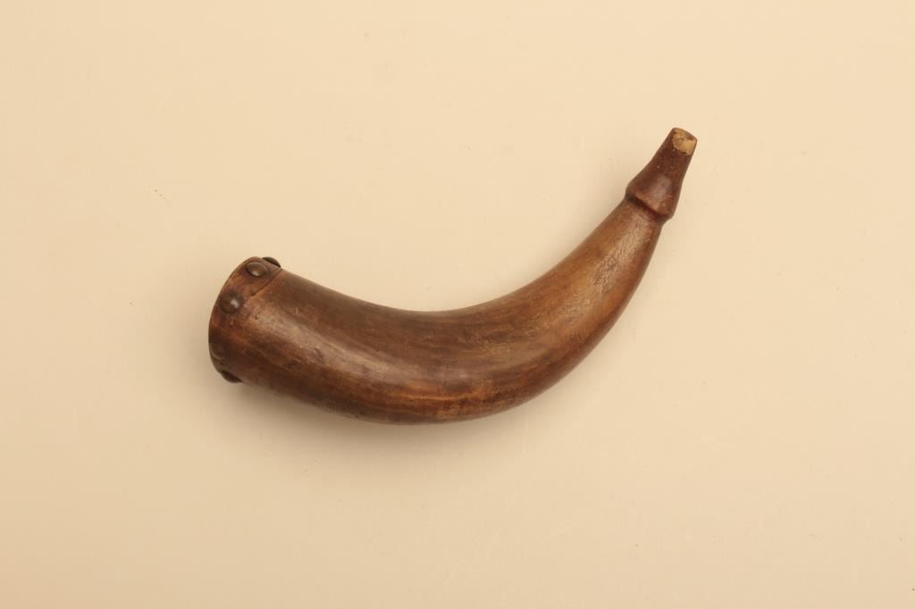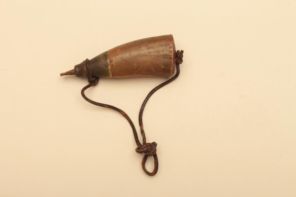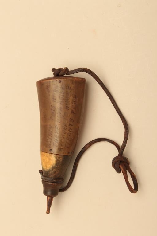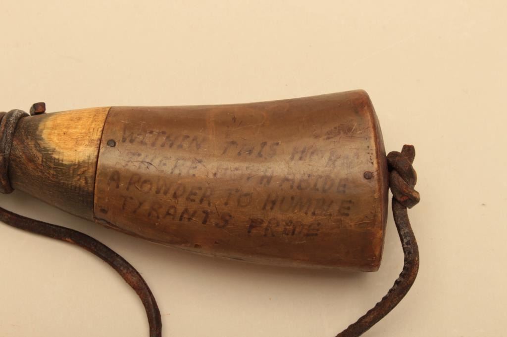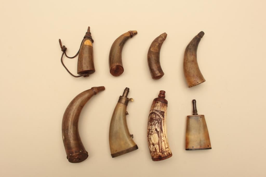Lot of various size and type of powder horns. 1 small horn has an interesting poem. All antique. Est.: $250-$500