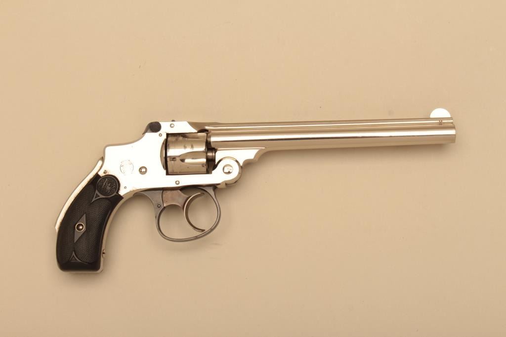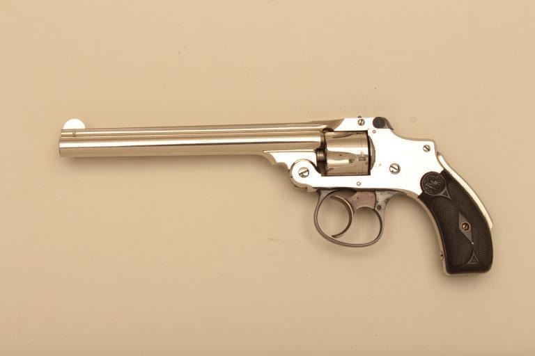 Smith & Wesson 32 Safety Second Model DA revolver, .32 S&W caliber, scarce 6” barrel, nickel finish, checkered hard rubber grips, S/N 98712; in overall fine to excellent condition with fine bore, action, markingsand grips. (C&R). Est.: $600-$1,200.