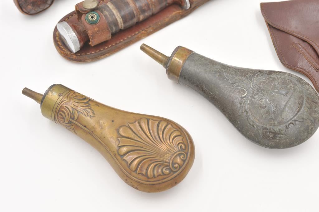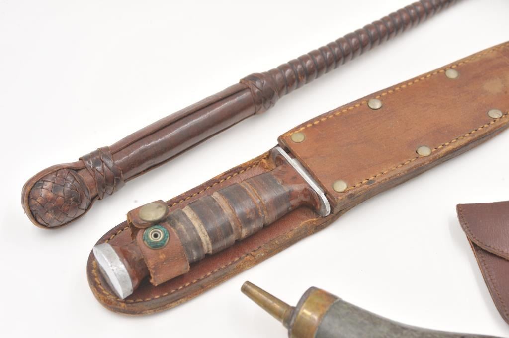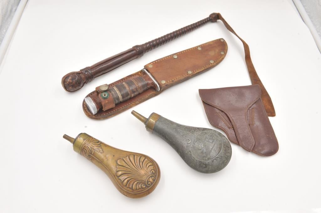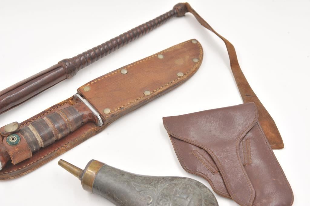 Bonanza lot as described: 1. 2 19th century Navy size powder flasks 2. Flap holster for German auto.’ 3. K-Bar knife with nickeled blade and scabbard. Olean, N.Y. marked. Fine blade.4. Leather quirt. Est.: $150-$300