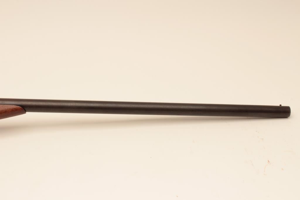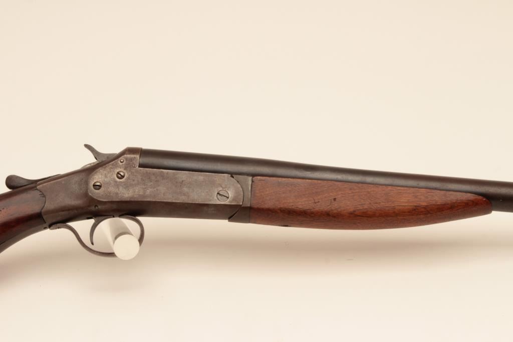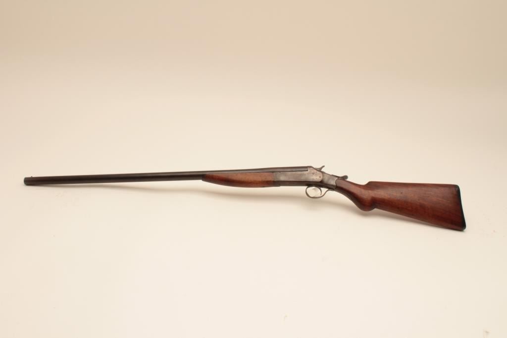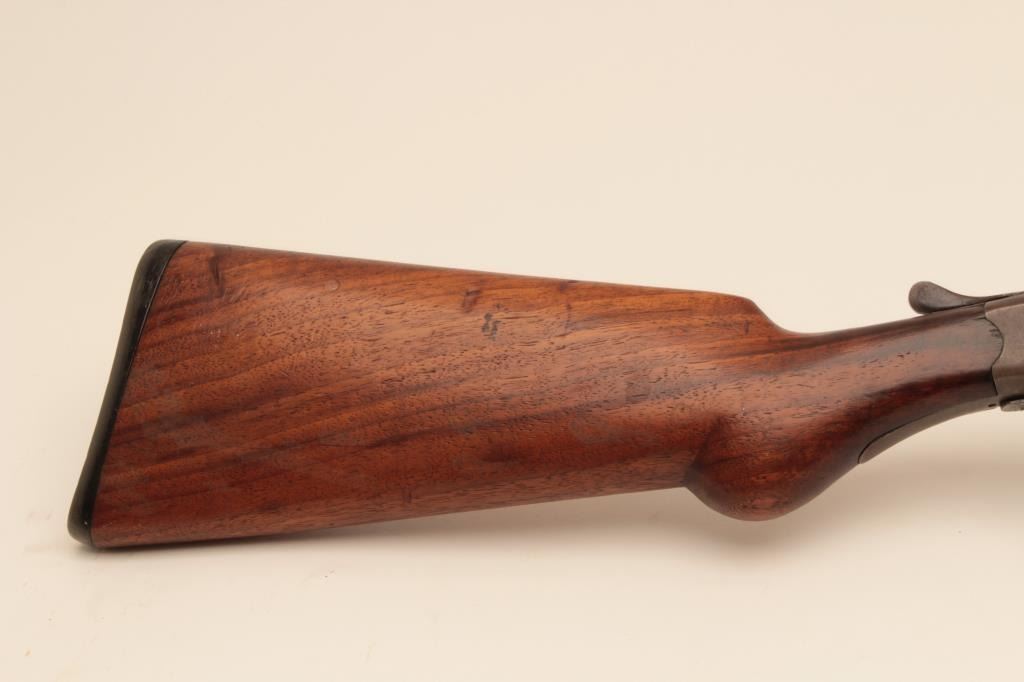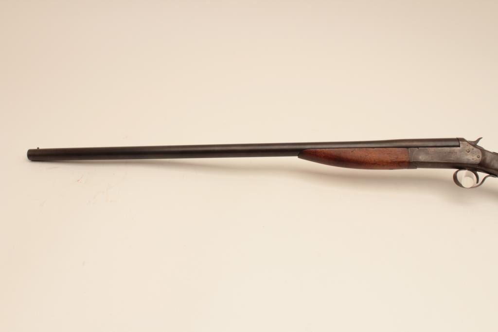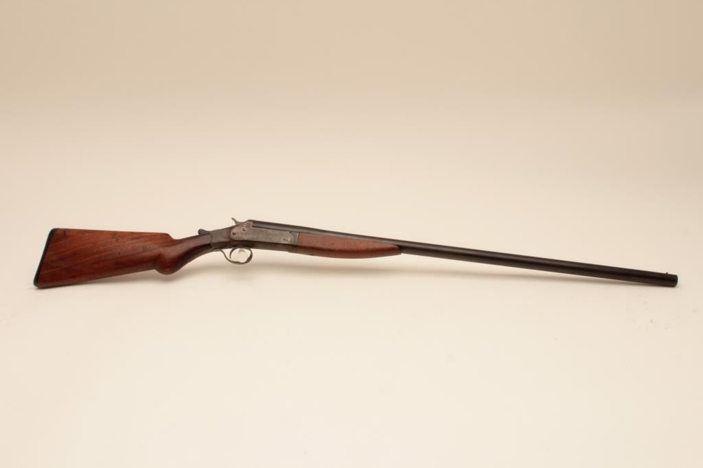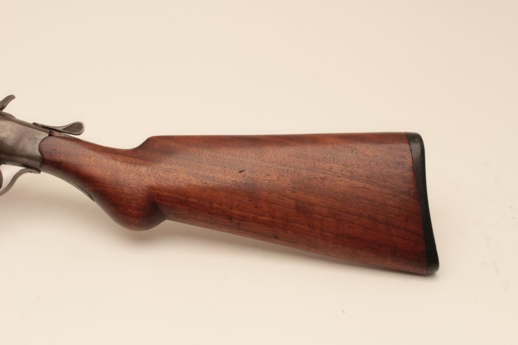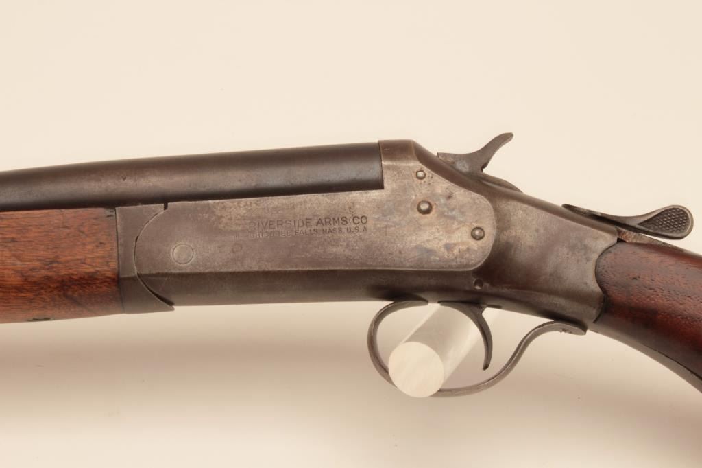 Riverside Arms single shot shotgun, #NSNV, 12 Ga., 30" barrel, blued finish, exposed hammer, smooth stock. Shotgun is in good condition overall, stock is chipped on the left side at the upper tang (3/8" x 1" loss), original buttplate intact. Bore is good and will improve with cleaning. good action. (C&R) Est. $75-150