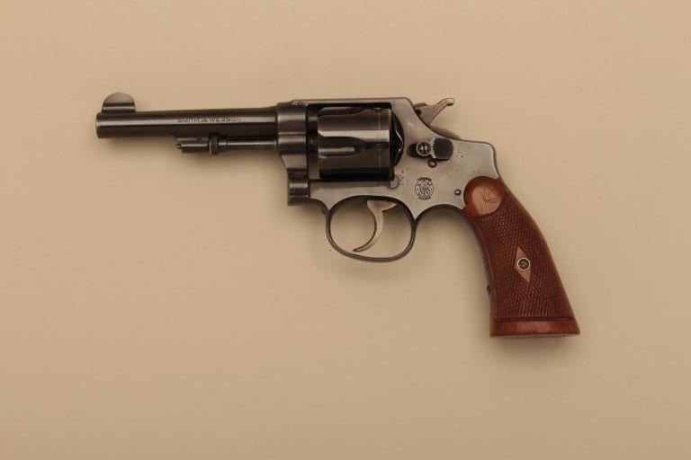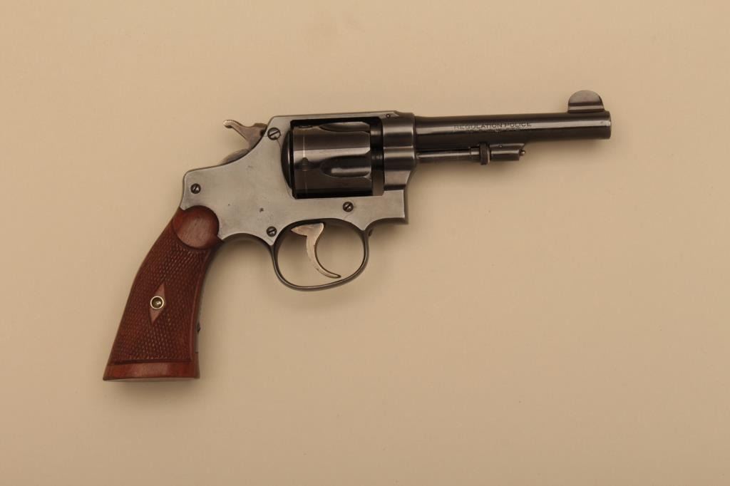 Smith & Wesson Regulation Police Model DA revolver, .38 S&W caliber, 4” barrel, blued finish, checkered wood grips, S/N 13717; overall fine condition with majority of original finish remaining, very good to finebore, crisp action and markings, fine grips. (C&R). Est.: $350-$700.