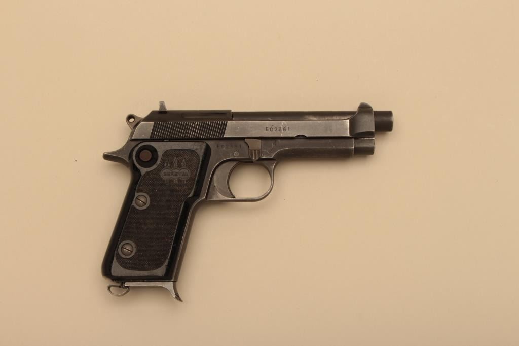 Beretta Model 1951, E02361, 9mm, 4 1/2" barrel, matte finish, checkered logo grips. Pistol is in good to very good condition, good action and bore, grips are good wtih no chips or cracks. Gun retains approximately60-80% original finish, which is thinning. One mag. (C&R/PPT) Est. $300-600