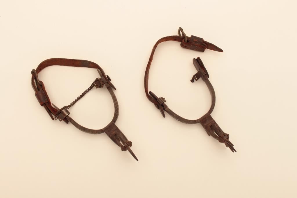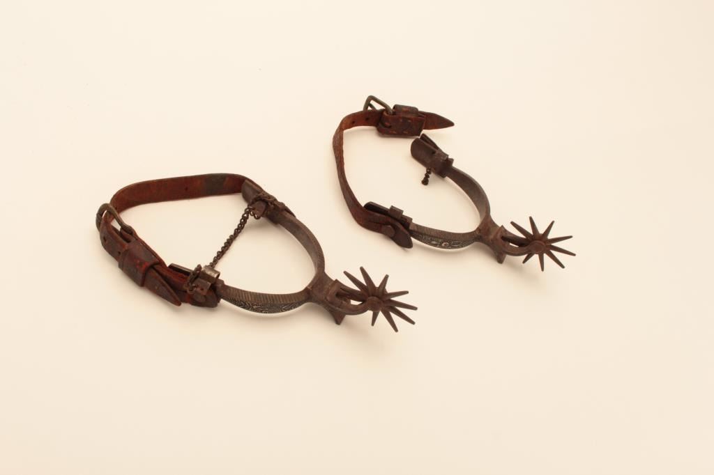 Pair of Southwestern style century spurs with silver inlay and original leather and chains. Uncleaned. Collected in early 1960’s by our consignor who obtained them from a New Mexico pioneer who settled in Pasadena inold age. Est.: $250-$500