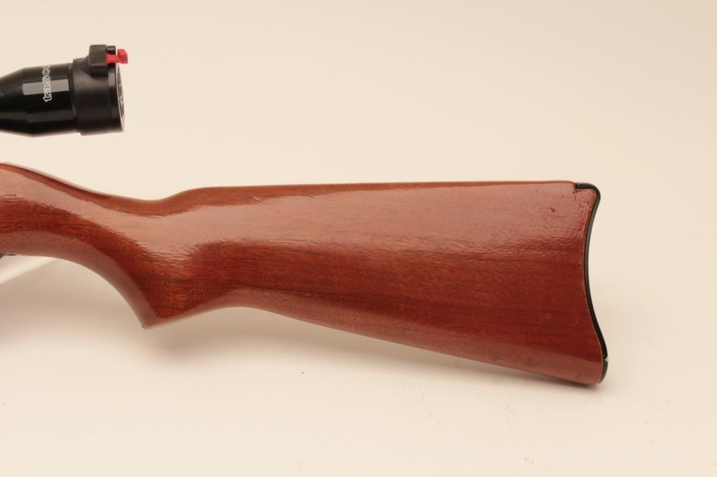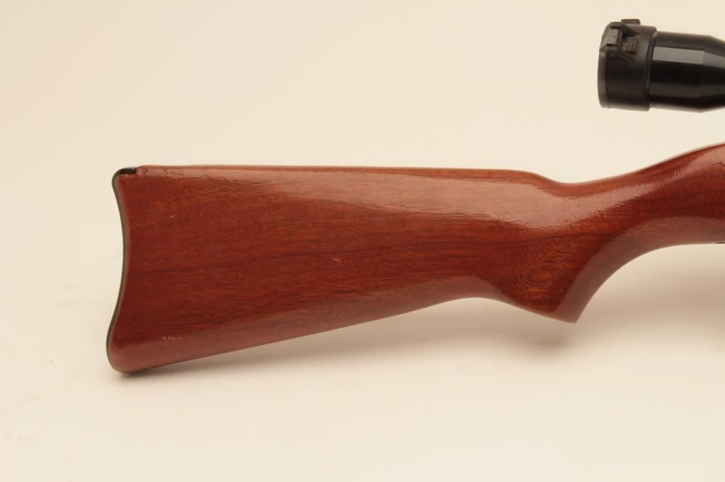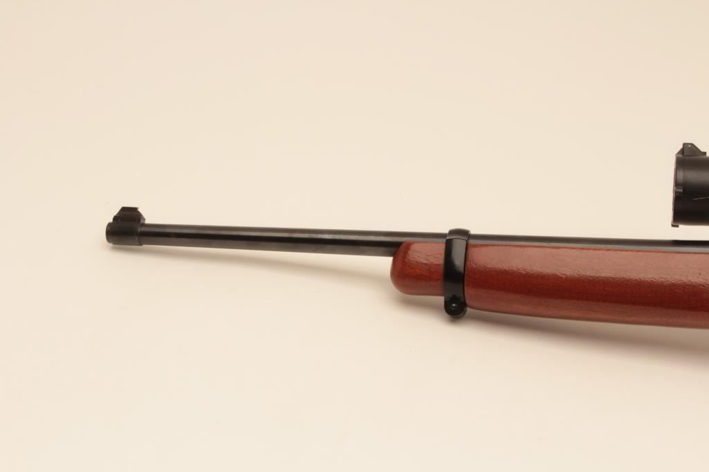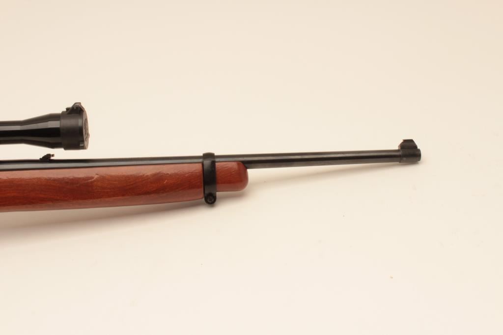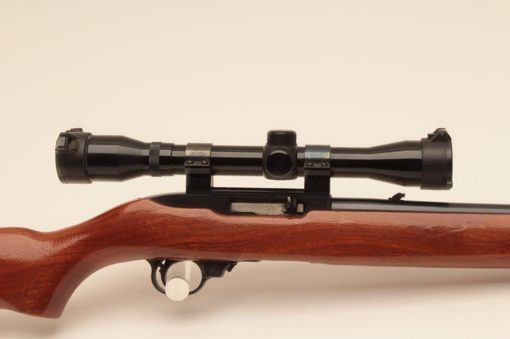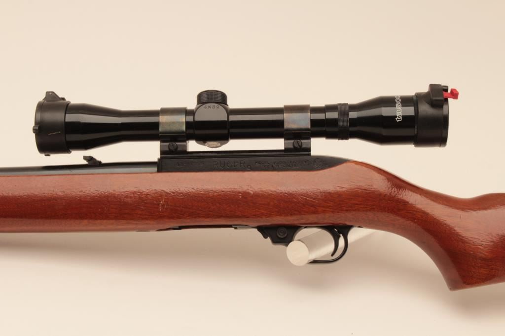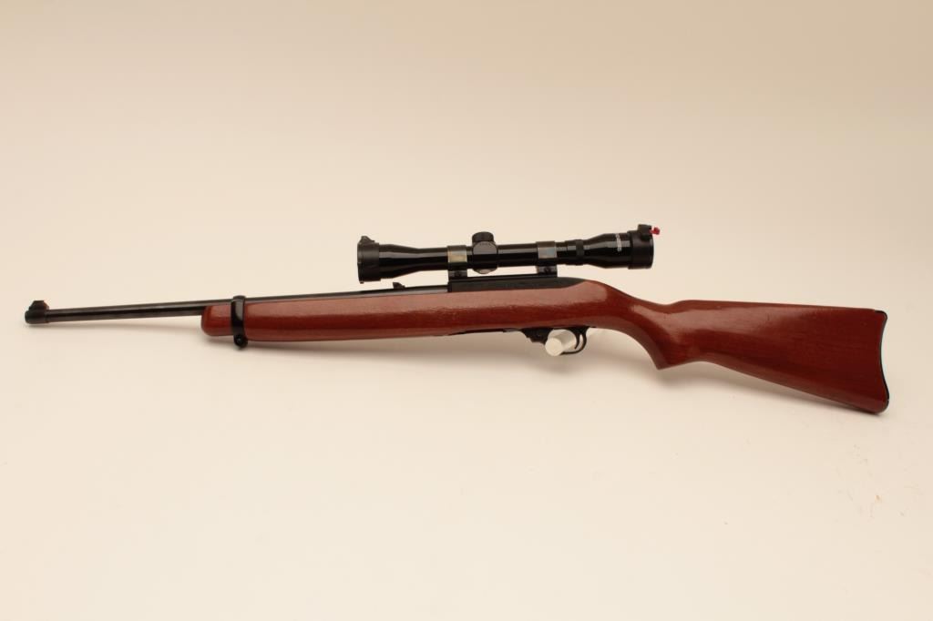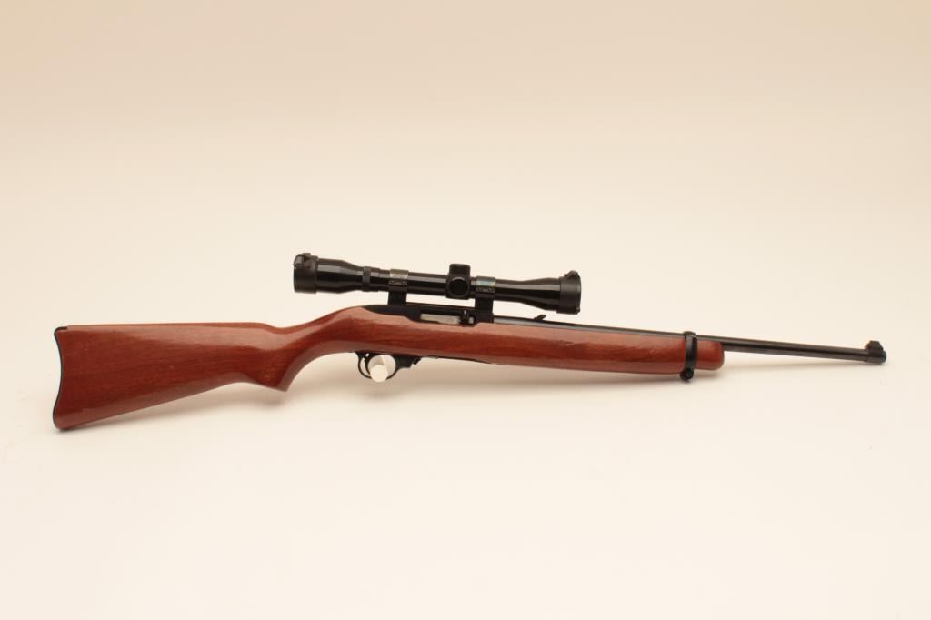 Ruger 10/22, #112-20458, .22 LR, 18 1/2" barrel, smooth walnut stock. Rifle is in fine condition overall, showing 95% original finish, stock is very good, bore is very good, good action. Mounted with a Tasco 4x32 scope. No mag. (Modern) Est. $125-250