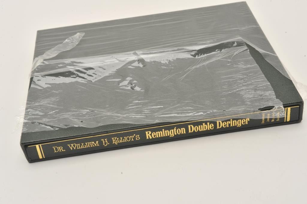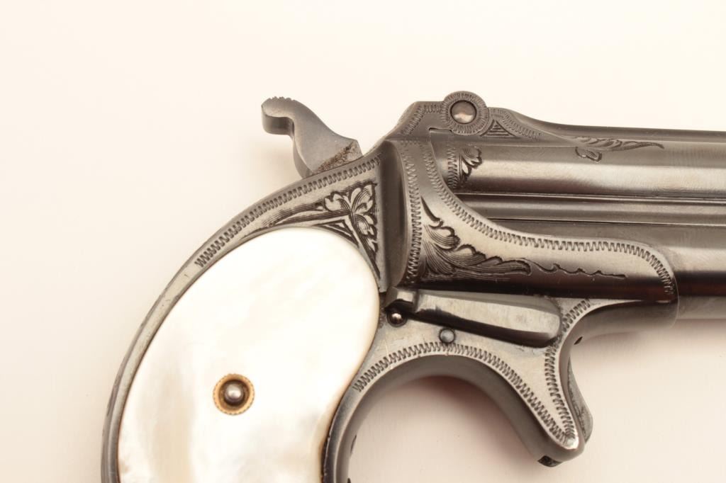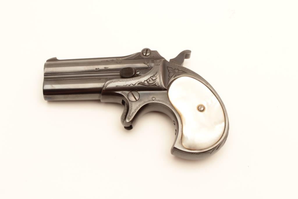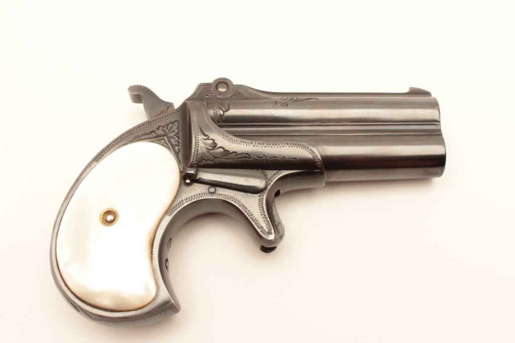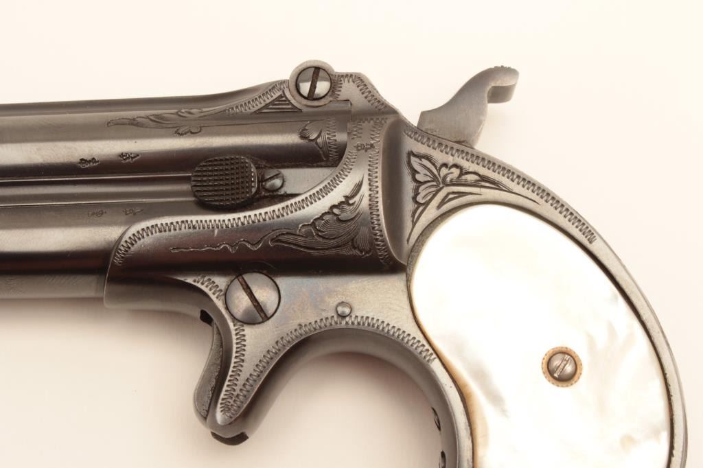 Remington Double Derringer in .41 caliber rim fire with last address “Remington Arms U.M.C. Co. Ilion, New York”, S/N 155. Custom engraved in factory style for Charles Lee Karr author of early text “RemingtonHandguns” and his initials “C.L.K.” on the backstrap. Listed in the Karl F. Moldenauer collection of Remington Arms item #223. Lightly scroll engraved with British proofs and pear grips. Excellent as refurbished atthe time of engraving. Display case included. See Karr book. The collection of Doug Drummond with a copy of his book. (Antique) Est.: $1750-3500