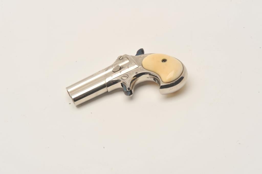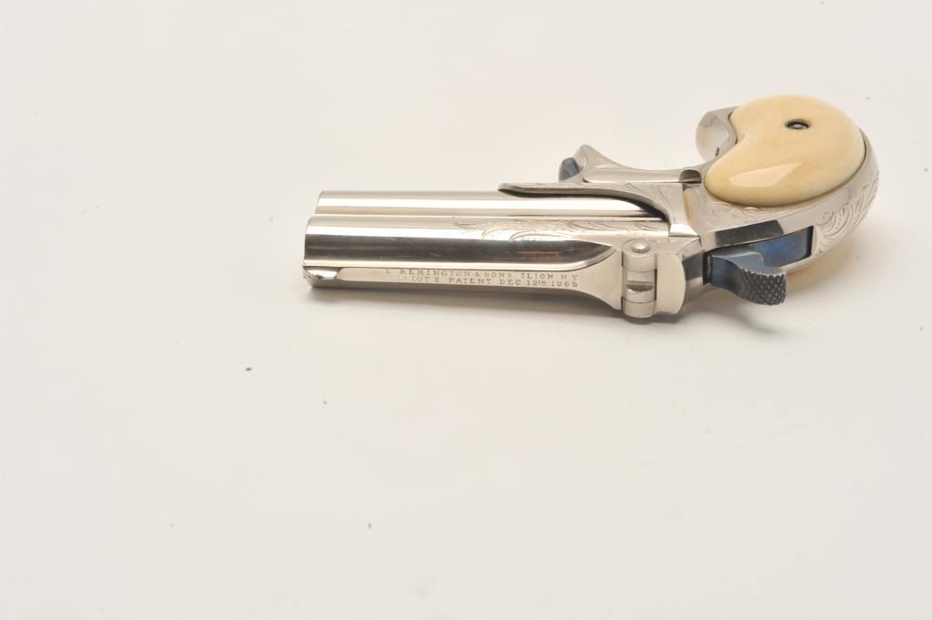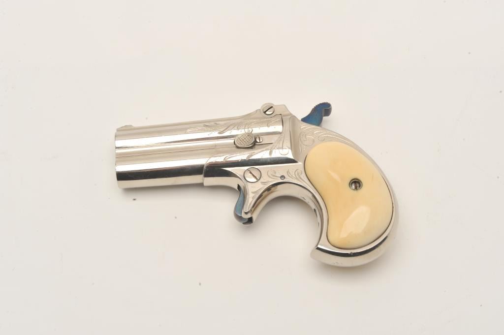 Superb Remington Double Derringer in .41 caliber rim fire with two line address, S/N 2888. Factory style open scroll engraved with ivory grips and nickel plated remaining in fine original condition with 98% plusoriginal nickel and stunning fire blue on the hammer and trigger with almost 100% remaining. Fine original ivory with light yellow patina. Crisp with fine address. No imperfections. A solid 9.9 on a 1-10 scale.The collection of Doug Drummond with a copy of his book. (Antique) Est.: $2100-4200
