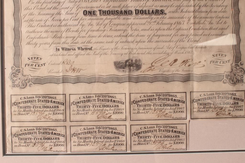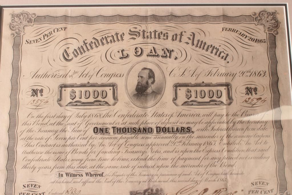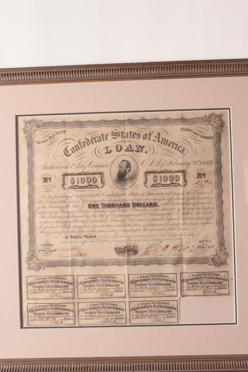 Confederate states of America $1000 war bond with portrait of General Stone Wall Jackson at center. No. 13594. C.S.A. issued 1863 at 7 % interest fully signed by Registry of Treasury with 7 coupons also signed. 1 coupon clipped (Cashed?). Very good condition with just normal paper aging. Authentic. Measures 13 ½” x 13 ½”. Est.: $300-$600