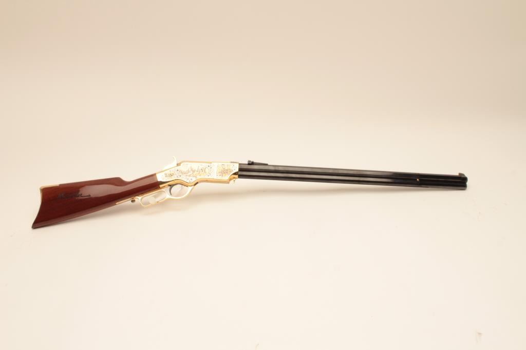 Taylor’s & Co. Modern copy of a Henry lever action rifle, Gettysburg Tribute Commemorative.44 W.C.F. caliber, 24” octagon barrel, blued finish to barrel assembly with decorated gold colored frame, lever and buttplate, wood butt stock with “MKunstler” branded on both sides of stock; S/N 124 of 500; overall like new condition. (Modern). Est.: $750-$1,500.