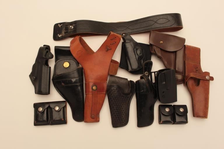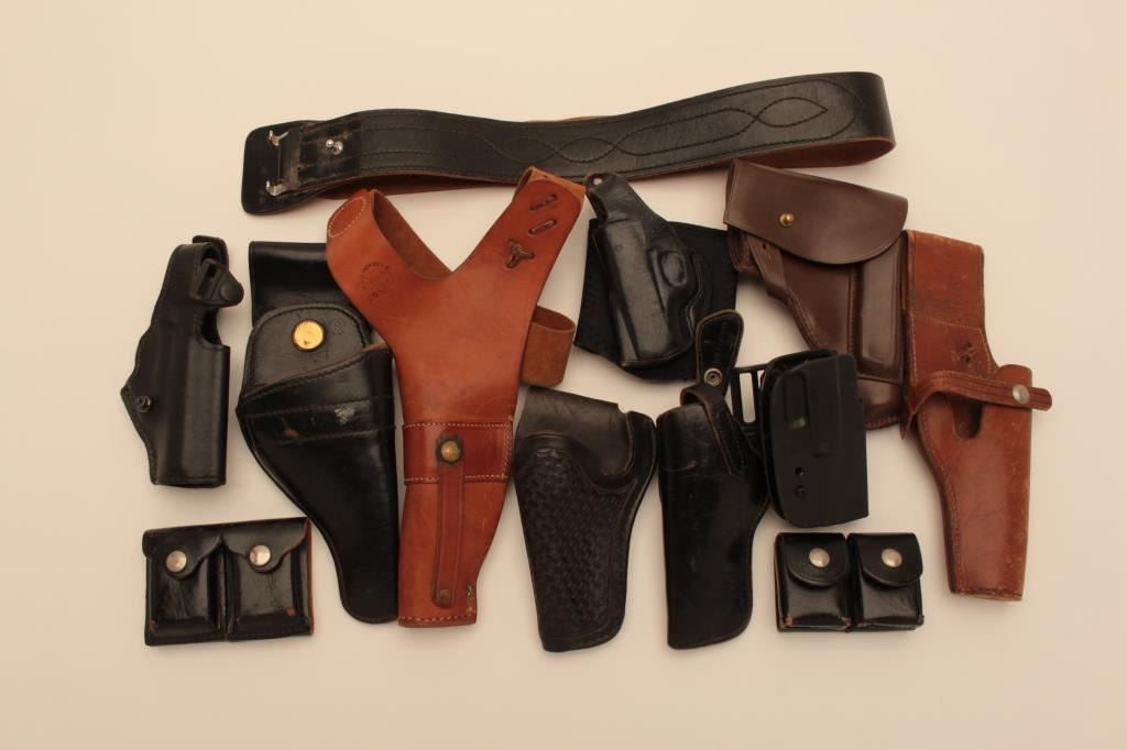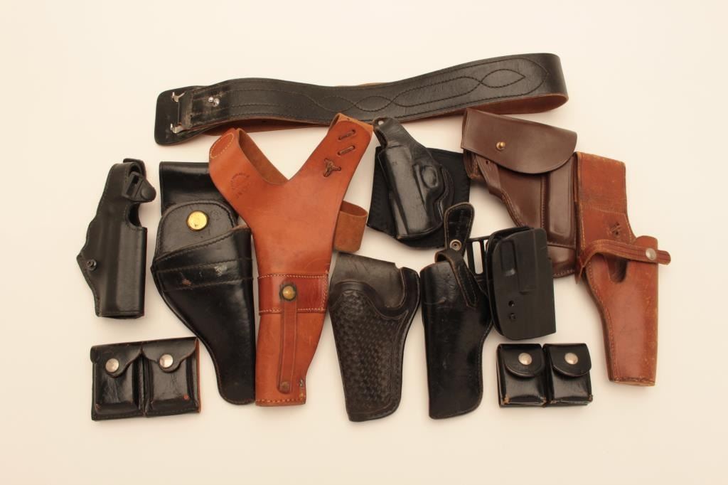 Leather lot of 12 holsters, assorted leather gun belts, leather shoulder holster, magazine pouches, leather slings, ammunition holders, flashlight and other assorted leather gear. All items are in good condition or better.Est.: $150-$300.