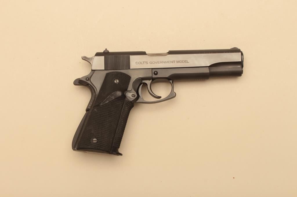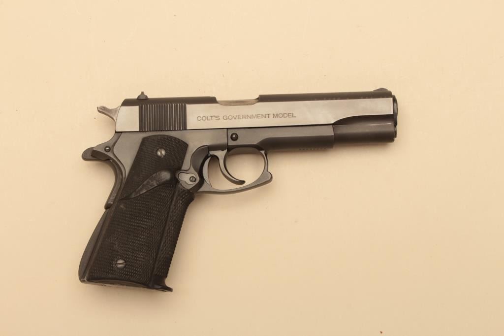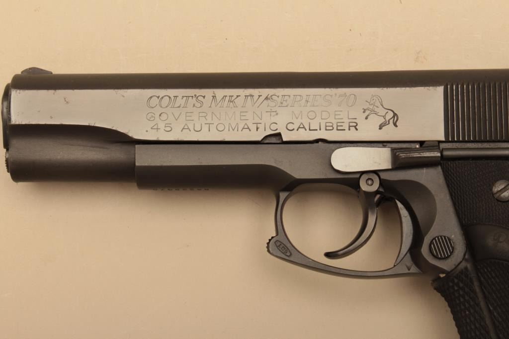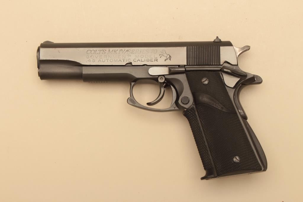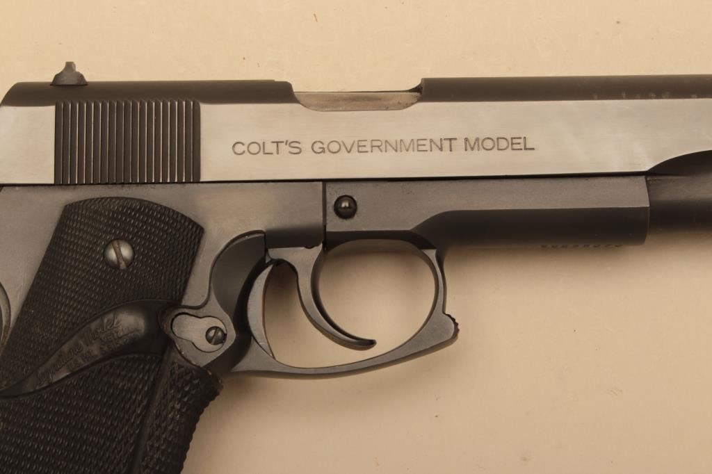 Colt series 70 Government model .45 caliber Semi-Auto pistol with custom L.W.S. marked conversion to double action feature along with squared trigger guard, Pachmayr grips, and combat features. Very good to finecondition with 90%-95% finishes showing some evidence of holstering and use. Excellent bore and good action. S/N 56235G70. (Modern/PPT) est.: $750-$1500