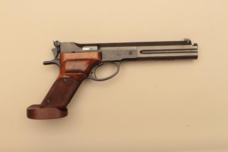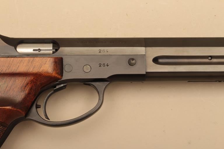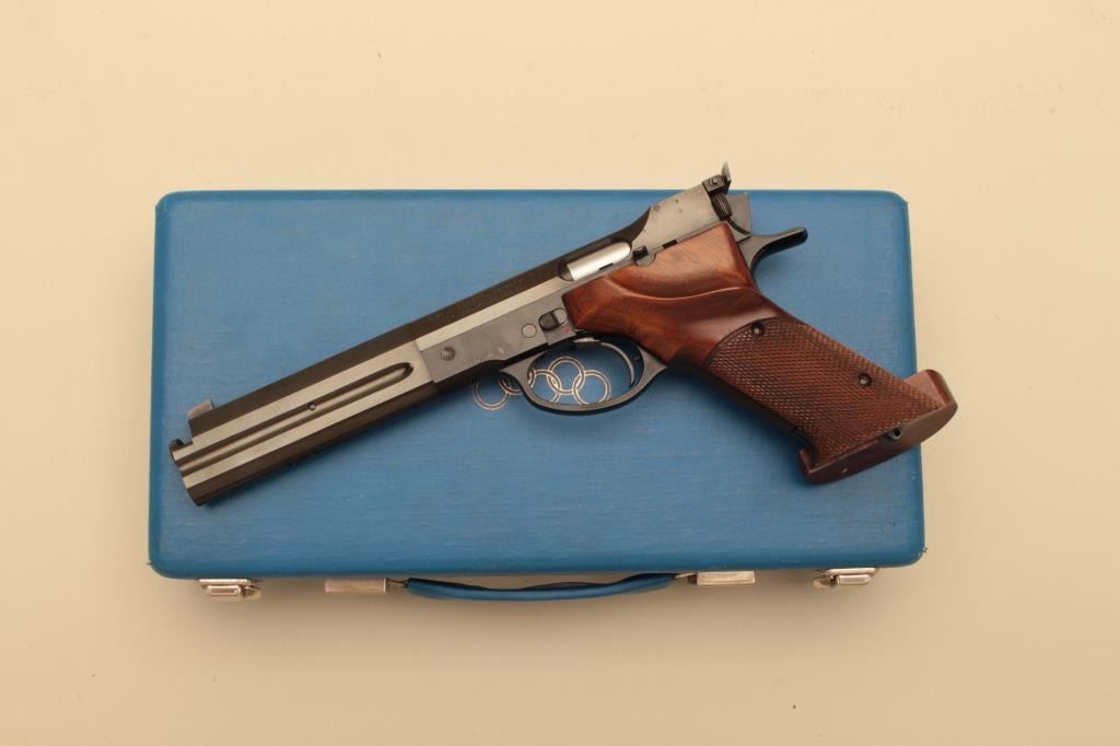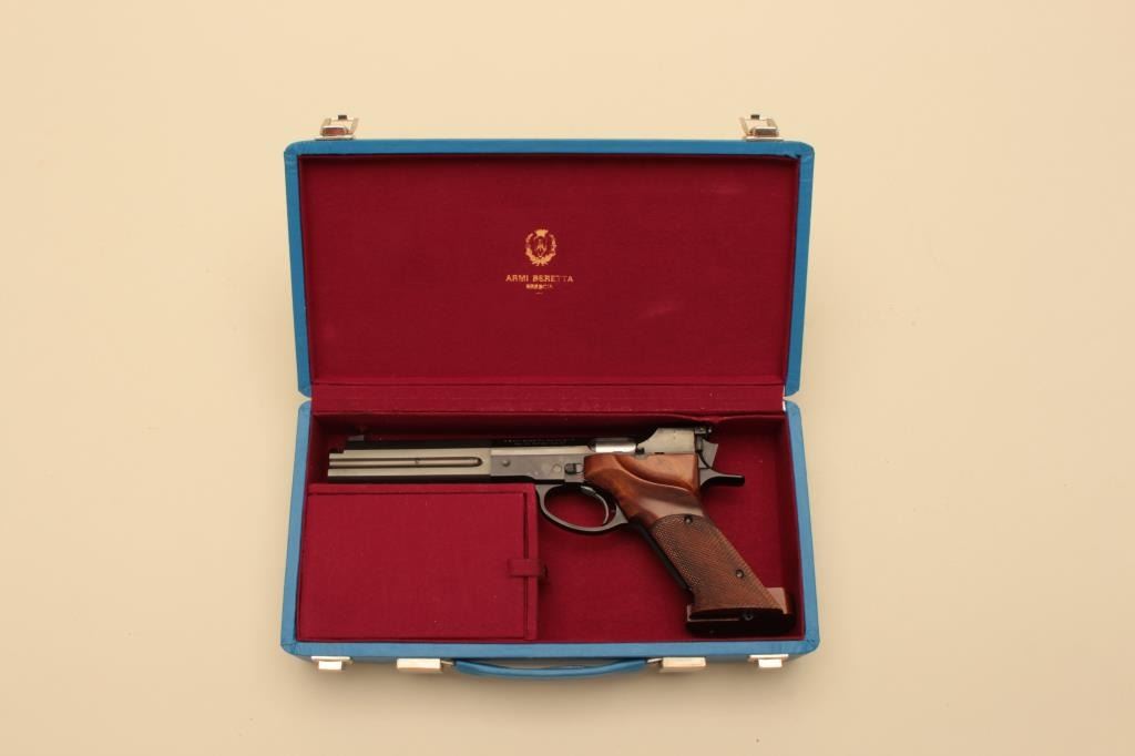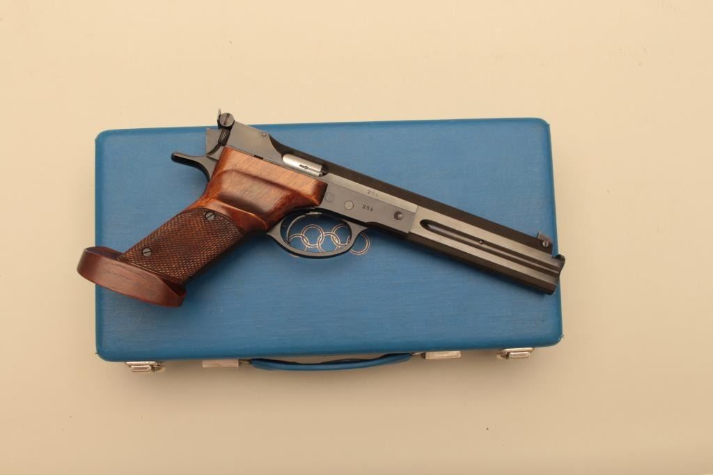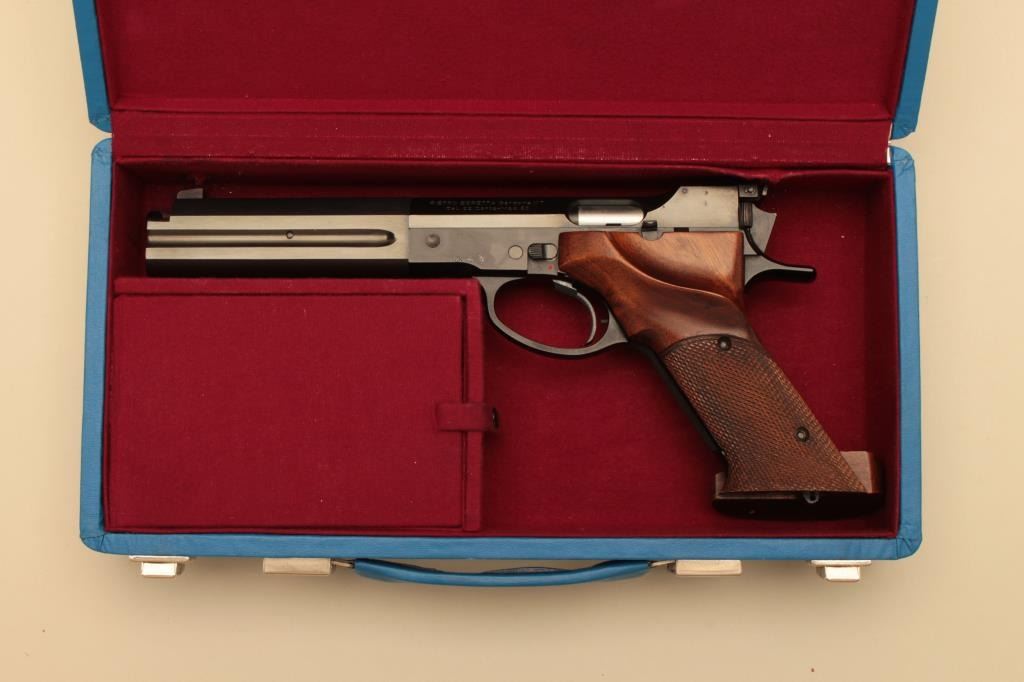 Beretta Model 80 .22 Short caliber Match pistol with Olympic symbol on the lid of case, S/N 264. Fine to excellent condition with extra clip (2 Total) and accessories. No import marks. Purportedly obtained by London guns from Italian diplomat in the 70s to early 80’s. Only example we have seen. Fine quality. 99% plus. (Modern/PPT) Est.: $700-$1400