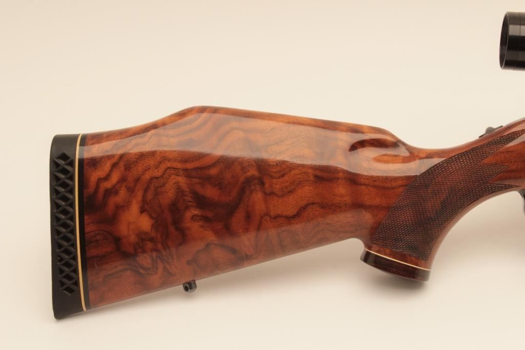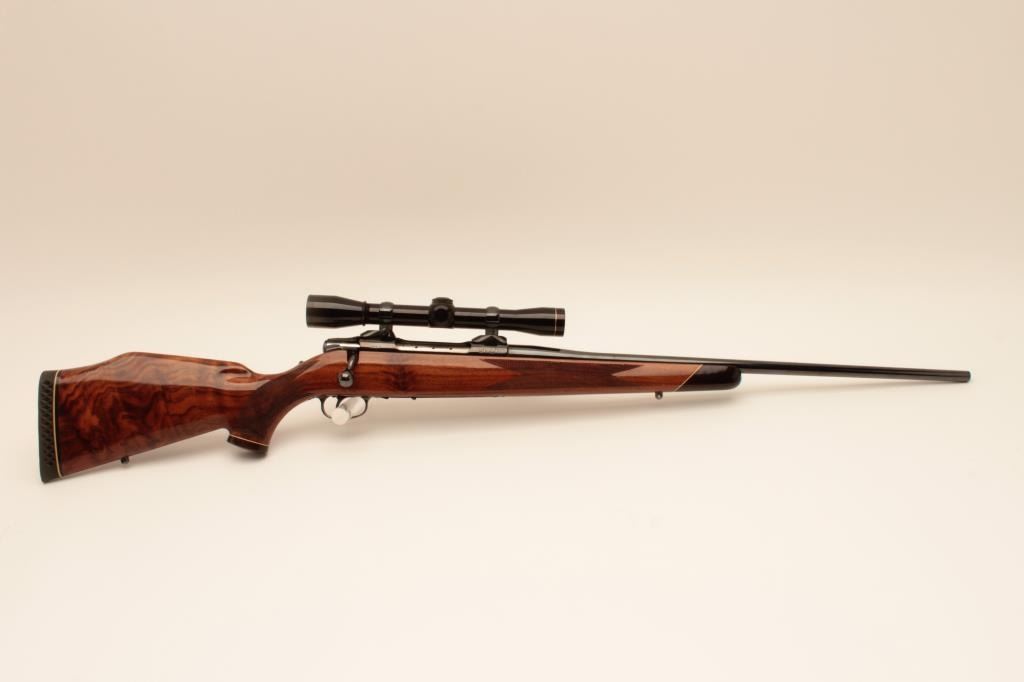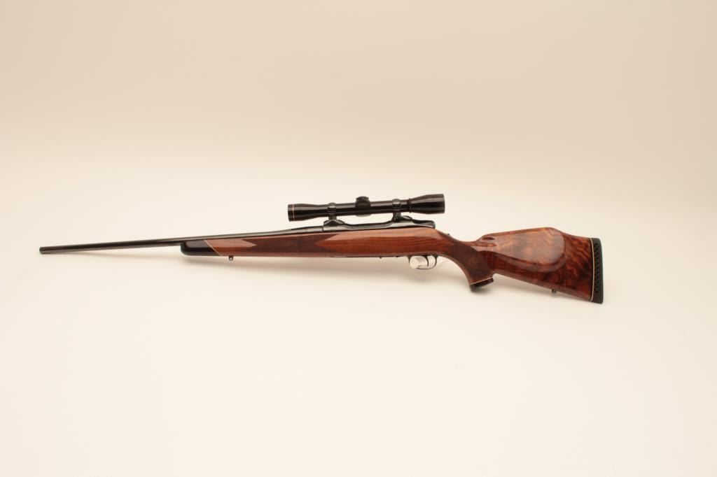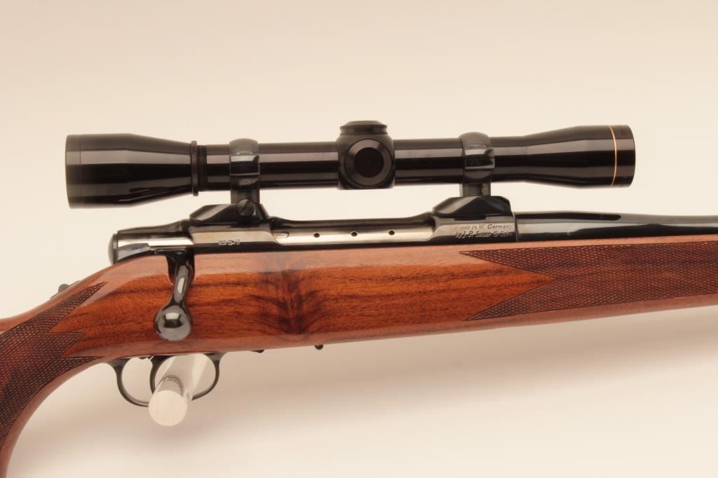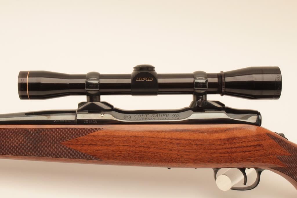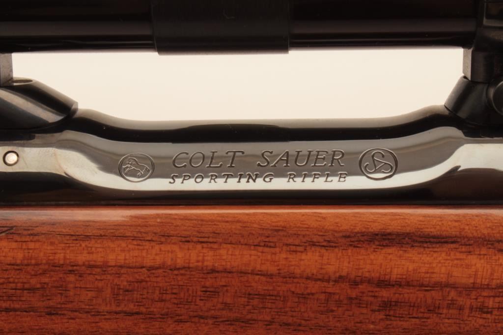 Colt Sauer Bolt Action Sporting Rifle in .270 Win Caliber with Leupold M8-4x Scope on factory mounts, with 3 clips, sling, and luggage case, S/N CR18431. Selected by London Guns 1970-80s for top customer who wantedexceptional burl. A Pachmayr pad has been added. Fine to excellent used condition. Minor marks. 96%-98% overall. (Modern) Est.: $1250-$2500