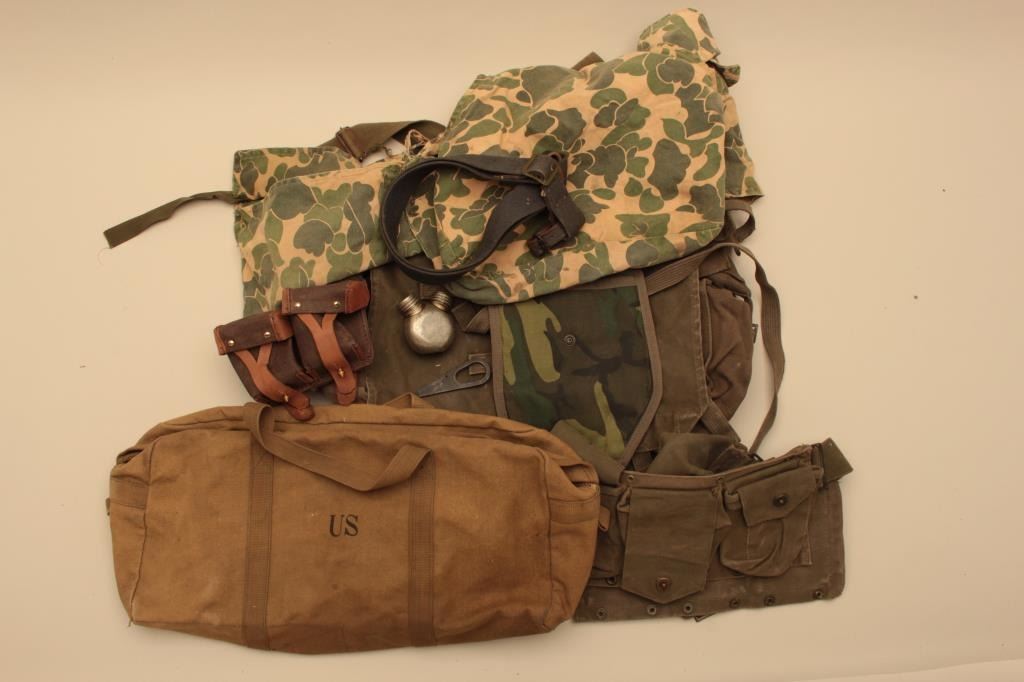 Lot of military web gear including canvas bags, magazine pouches, belts, desert storm hats, leather magazine pouches, canteen and other assorted military accoutrements. Est.: $100-$200.